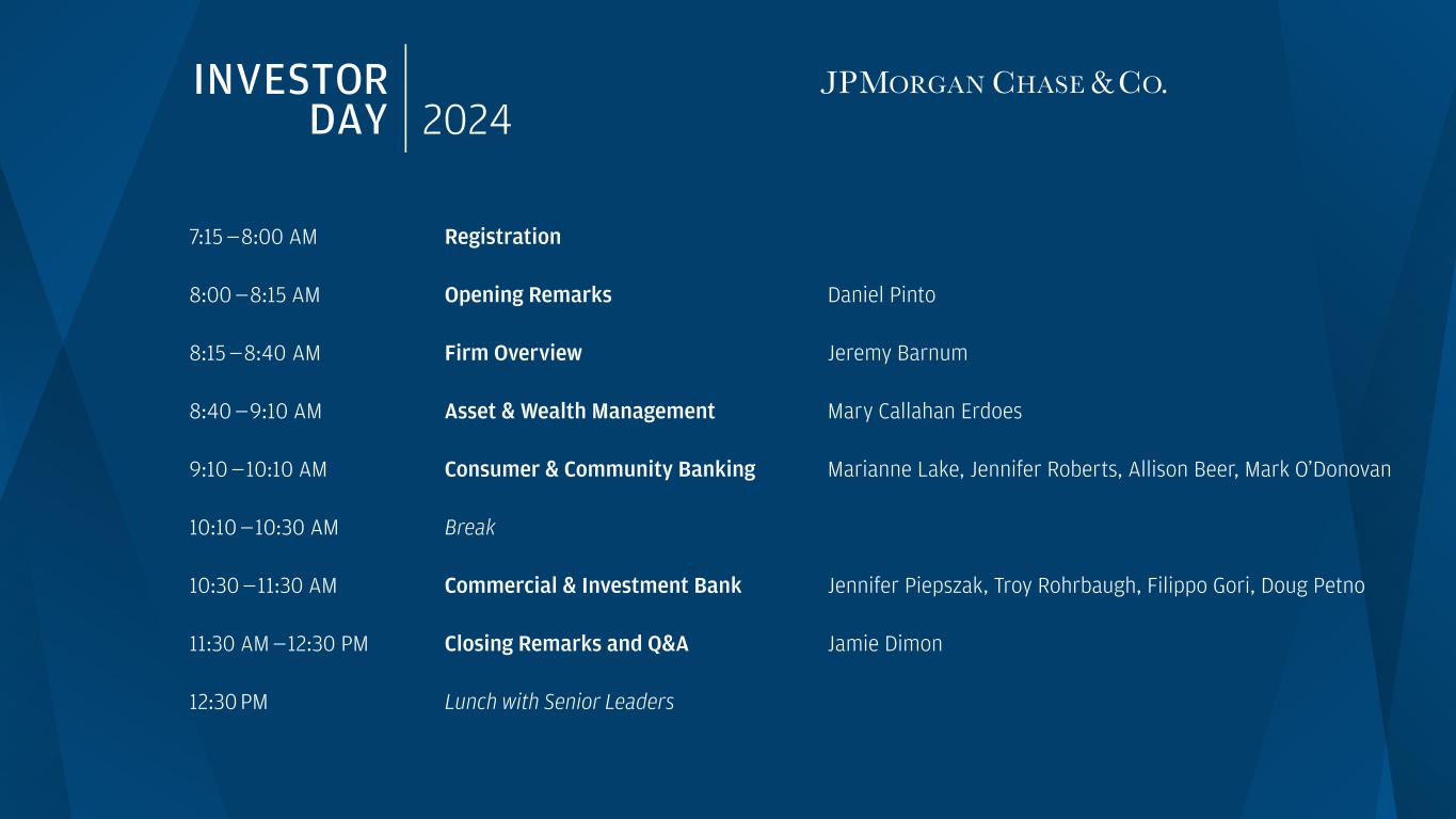 INVESTOR DAY 2024 Registration Opening Remarks Daniel Pinto Firm Overview Jeremy Barnum Asset & Wealth Management Mary Callahan Erdoes Consumer & Community Banking Marianne Lake, Jennifer Roberts, Allison Beer, Mark O’Donovan Break Commercial & Investment Bank Jennifer Piepszak, Troy Rohrbaugh, Filippo Gori, Doug Petno Closing Remarks and Q&A Jamie Dimon 7:15 — 8:00 AM 8:00 — 8:15 AM 8:15 — 8:40 AM 8:40 — 9:10 AM 9:10 — 10:10 AM 10:10 — 10:30 AM 10:30 — 11:30 AM 11:30 AM — 12:30 PM 12:30 PM Lunch with Senior Leaders