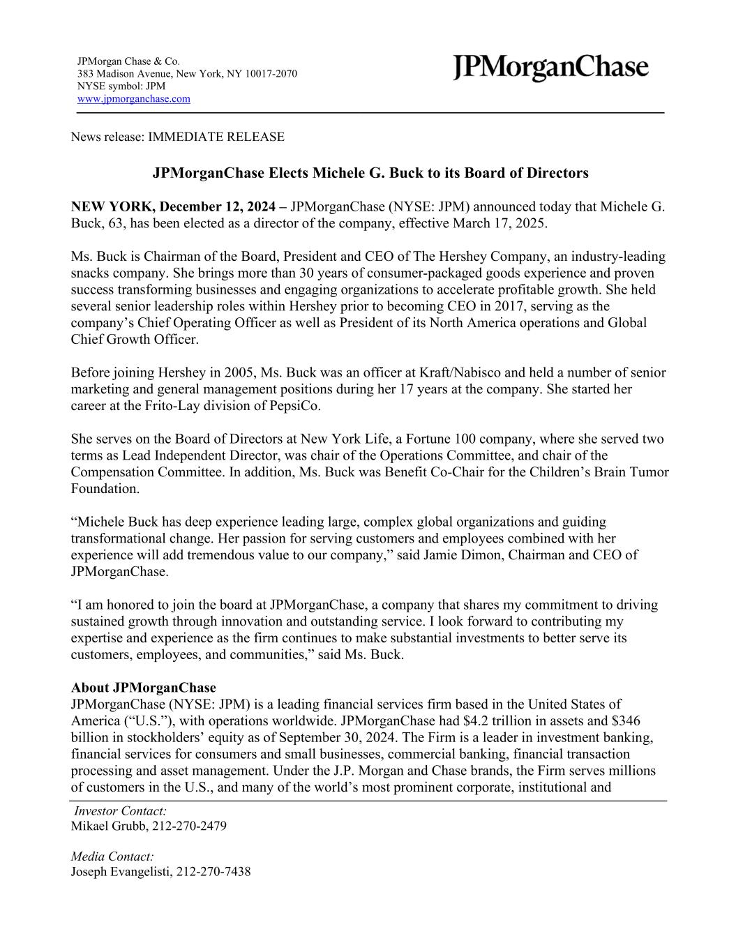 JPMorgan Chase & Co. 383 Madison Avenue, New York, NY 10017-2070 NYSE symbol: JPM www.jpmorganchase.com News release: IMMEDIATE RELEASE Investor Contact: Mikael Grubb, 212-270-2479 Media Contact: Joseph Evangelisti, 212-270-7438 JPMorganChase Elects Michele G. Buck to its Board of Directors NEW YORK, December 12, 2024 – JPMorganChase (NYSE: JPM) announced today that Michele G. Buck, 63, has been elected as a director of the company, effective March 17, 2025. Ms. Buck is Chairman of the Board, President and CEO of The Hershey Company, an industry-leading snacks company. She brings more than 30 years of consumer-packaged goods experience and proven success transforming businesses and engaging organizations to accelerate profitable growth. She held several senior leadership roles within Hershey prior to becoming CEO in 2017, serving as the company’s Chief Operating Officer as well as President of its North America operations and Global Chief Growth Officer. Before joining Hershey in 2005, Ms. Buck was an officer at Kraft/Nabisco and held a number of senior marketing and general management positions during her 17 years at the company. She started her career at the Frito-Lay division of PepsiCo. She serves on the Board of Directors at New York Life, a Fortune 100 company, where she served two terms as Lead Independent Director, was chair of the Operations Committee, and chair of the Compensation Committee. In addition, Ms. Buck was Benefit Co-Chair for the Children’s Brain Tumor Foundation. “Michele Buck has deep experience leading large, complex global organizations and guiding transformational change. Her passion for serving customers and employees combined with her experience will add tremendous value to our company,” said Jamie Dimon, Chairman and CEO of JPMorganChase. “I am honored to join the board at JPMorganChase, a company that shares my commitment to driving sustained growth through innovation and outstanding service. I look forward to contributing my expertise and experience as the firm continues to make substantial investments to better serve its customers, employees, and communities,” said Ms. Buck. About JPMorganChase JPMorganChase (NYSE: JPM) is a leading financial services firm based in the United States of America (“U.S.”), with operations worldwide. JPMorganChase had $4.2 trillion in assets and $346 billion in stockholders’ equity as of September 30, 2024. The Firm is a leader in investment banking, financial services for consumers and small businesses, commercial banking, financial transaction processing and asset management. Under the J.P. Morgan and Chase brands, the Firm serves millions of customers in the U.S., and many of the world’s most prominent corporate, institutional and