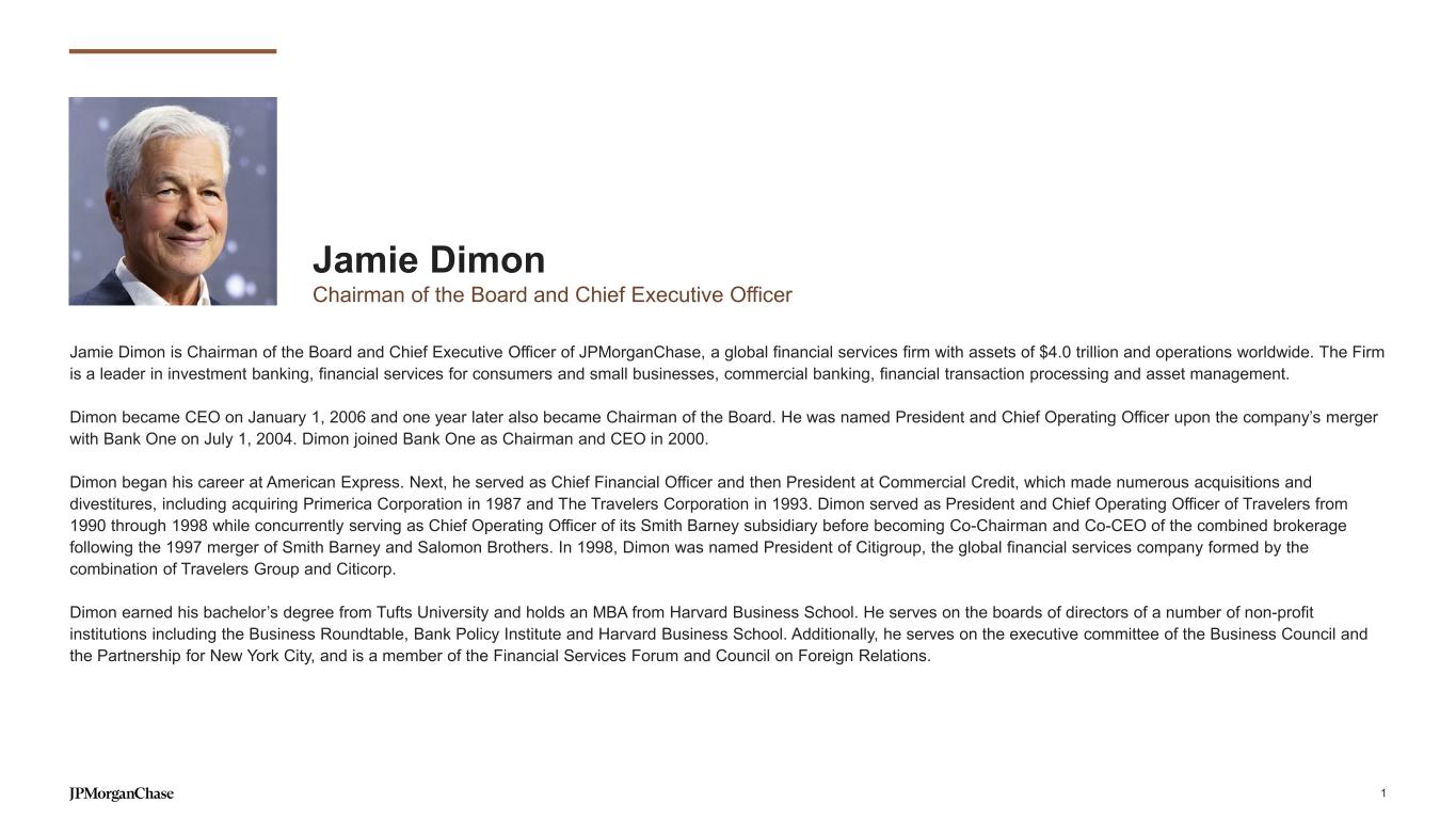 Jamie Dimon Chairman of the Board and Chief Executive Officer Jamie Dimon is Chairman of the Board and Chief Executive Officer of JPMorganChase, a global financial services firm with assets of $4.0 trillion and operations worldwide. The Firm is a leader in investment banking, financial services for consumers and small businesses, commercial banking, financial transaction processing and asset management. Dimon became CEO on January 1, 2006 and one year later also became Chairman of the Board. He was named President and Chief Operating Officer upon the company’s merger with Bank One on July 1, 2004. Dimon joined Bank One as Chairman and CEO in 2000. Dimon began his career at American Express. Next, he served as Chief Financial Officer and then President at Commercial Credit, which made numerous acquisitions and divestitures, including acquiring Primerica Corporation in 1987 and The Travelers Corporation in 1993. Dimon served as President and Chief Operating Officer of Travelers from 1990 through 1998 while concurrently serving as Chief Operating Officer of its Smith Barney subsidiary before becoming Co-Chairman and Co-CEO of the combined brokerage following the 1997 merger of Smith Barney and Salomon Brothers. In 1998, Dimon was named President of Citigroup, the global financial services company formed by the combination of Travelers Group and Citicorp. Dimon earned his bachelor’s degree from Tufts University and holds an MBA from Harvard Business School. He serves on the boards of directors of a number of non-profit institutions including the Business Roundtable, Bank Policy Institute and Harvard Business School. Additionally, he serves on the executive committee of the Business Council and the Partnership for New York City, and is a member of the Financial Services Forum and Council on Foreign Relations. 1