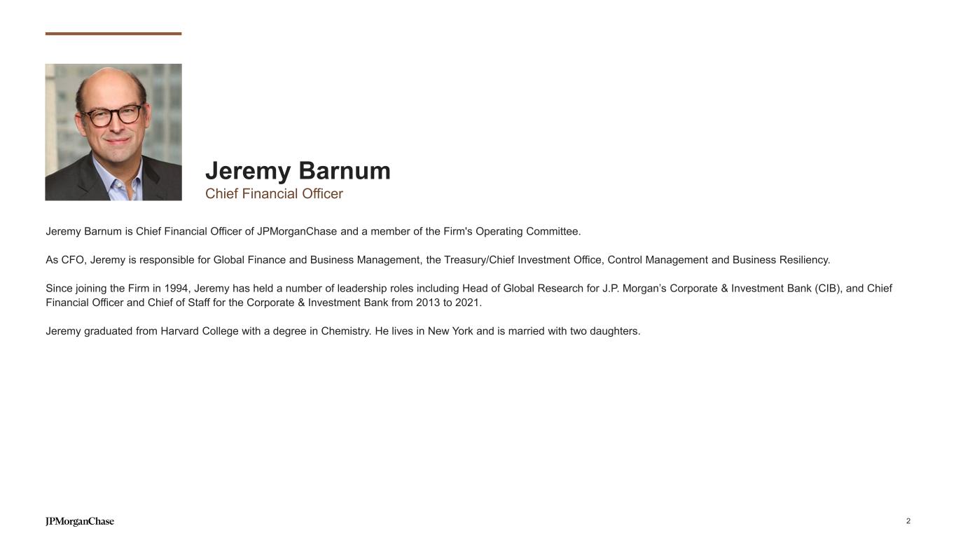 Jeremy Barnum Chief Financial Officer Jeremy Barnum is Chief Financial Officer of JPMorganChase and a member of the Firm's Operating Committee. As CFO, Jeremy is responsible for Global Finance and Business Management, the Treasury/Chief Investment Office, Control Management and Business Resiliency. Since joining the Firm in 1994, Jeremy has held a number of leadership roles including Head of Global Research for J.P. Morgan’s Corporate & Investment Bank (CIB), and Chief Financial Officer and Chief of Staff for the Corporate & Investment Bank from 2013 to 2021. Jeremy graduated from Harvard College with a degree in Chemistry. He lives in New York and is married with two daughters. 2