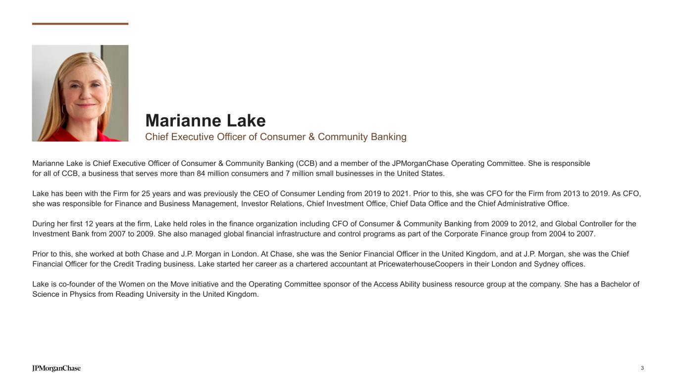 Marianne Lake Chief Executive Officer of Consumer & Community Banking Marianne Lake is Chief Executive Officer of Consumer & Community Banking (CCB) and a member of the JPMorganChase Operating Committee. She is responsible for all of CCB, a business that serves more than 84 million consumers and 7 million small businesses in the United States. Lake has been with the Firm for 25 years and was previously the CEO of Consumer Lending from 2019 to 2021. Prior to this, she was CFO for the Firm from 2013 to 2019. As CFO, she was responsible for Finance and Business Management, Investor Relations, Chief Investment Office, Chief Data Office and the Chief Administrative Office. During her first 12 years at the firm, Lake held roles in the finance organization including CFO of Consumer & Community Banking from 2009 to 2012, and Global Controller for the Investment Bank from 2007 to 2009. She also managed global financial infrastructure and control programs as part of the Corporate Finance group from 2004 to 2007. Prior to this, she worked at both Chase and J.P. Morgan in London. At Chase, she was the Senior Financial Officer in the United Kingdom, and at J.P. Morgan, she was the Chief Financial Officer for the Credit Trading business. Lake started her career as a chartered accountant at PricewaterhouseCoopers in their London and Sydney offices. Lake is co-founder of the Women on the Move initiative and the Operating Committee sponsor of the Access Ability business resource group at the company. She has a Bachelor of Science in Physics from Reading University in the United Kingdom. 3