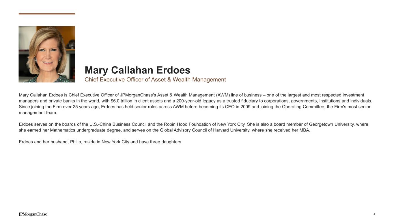 Mary Callahan Erdoes Chief Executive Officer of Asset & Wealth Management Mary Callahan Erdoes is Chief Executive Officer of JPMorganChase's Asset & Wealth Management (AWM) line of business – one of the largest and most respected investment managers and private banks in the world, with $6.0 trillion in client assets and a 200-year-old legacy as a trusted fiduciary to corporations, governments, institutions and individuals. Since joining the Firm over 25 years ago, Erdoes has held senior roles across AWM before becoming its CEO in 2009 and joining the Operating Committee, the Firm's most senior management team. Erdoes serves on the boards of the U.S.-China Business Council and the Robin Hood Foundation of New York City. She is also a board member of Georgetown University, where she earned her Mathematics undergraduate degree, and serves on the Global Advisory Council of Harvard University, where she received her MBA. Erdoes and her husband, Philip, reside in New York City and have three daughters. 4