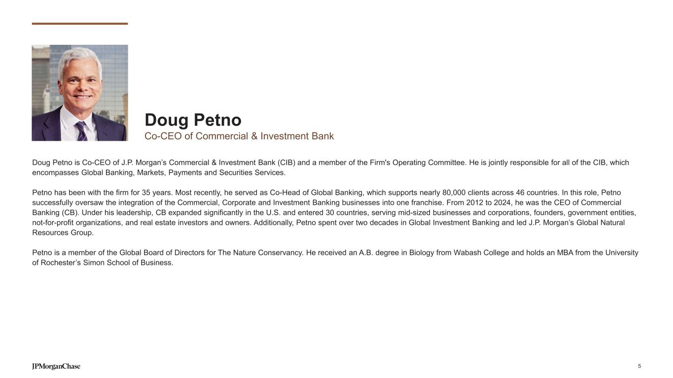 Doug Petno is Co-CEO of J.P. Morgan’s Commercial & Investment Bank (CIB) and a member of the Firm's Operating Committee. He is jointly responsible for all of the CIB, which encompasses Global Banking, Markets, Payments and Securities Services. Petno has been with the firm for 35 years. Most recently, he served as Co-Head of Global Banking, which supports nearly 80,000 clients across 46 countries. In this role, Petno successfully oversaw the integration of the Commercial, Corporate and Investment Banking businesses into one franchise. From 2012 to 2024, he was the CEO of Commercial Banking (CB). Under his leadership, CB expanded significantly in the U.S. and entered 30 countries, serving mid-sized businesses and corporations, founders, government entities, not-for-profit organizations, and real estate investors and owners. Additionally, Petno spent over two decades in Global Investment Banking and led J.P. Morgan’s Global Natural Resources Group. Petno is a member of the Global Board of Directors for The Nature Conservancy. He received an A.B. degree in Biology from Wabash College and holds an MBA from the University of Rochester’s Simon School of Business. Doug Petno Co-CEO of Commercial & Investment Bank 5