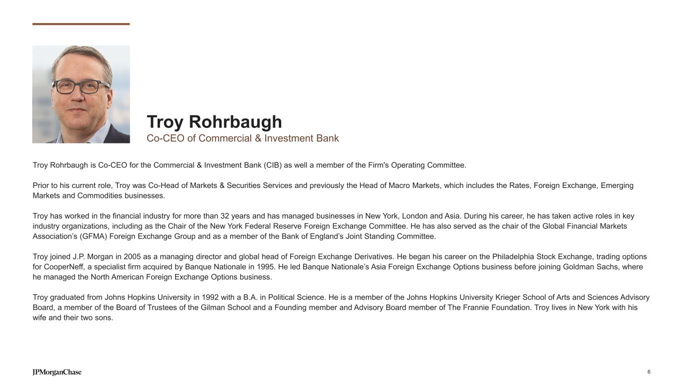 Troy Rohrbaugh Co-CEO of Commercial & Investment Bank Troy Rohrbaugh is Co-CEO for the Commercial & Investment Bank (CIB) as well a member of the Firm's Operating Committee. Prior to his current role, Troy was Co-Head of Markets & Securities Services and previously the Head of Macro Markets, which includes the Rates, Foreign Exchange, Emerging Markets and Commodities businesses. Troy has worked in the financial industry for more than 32 years and has managed businesses in New York, London and Asia. During his career, he has taken active roles in key industry organizations, including as the Chair of the New York Federal Reserve Foreign Exchange Committee. He has also served as the chair of the Global Financial Markets Association’s (GFMA) Foreign Exchange Group and as a member of the Bank of England’s Joint Standing Committee. Troy joined J.P. Morgan in 2005 as a managing director and global head of Foreign Exchange Derivatives. He began his career on the Philadelphia Stock Exchange, trading options for CooperNeff, a specialist firm acquired by Banque Nationale in 1995. He led Banque Nationale’s Asia Foreign Exchange Options business before joining Goldman Sachs, where he managed the North American Foreign Exchange Options business. Troy graduated from Johns Hopkins University in 1992 with a B.A. in Political Science. He is a member of the Johns Hopkins University Krieger School of Arts and Sciences Advisory Board, a member of the Board of Trustees of the Gilman School and a Founding member and Advisory Board member of The Frannie Foundation. Troy lives in New York with his wife and their two sons. 6
