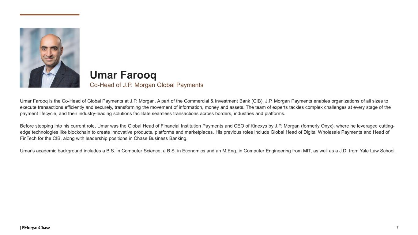 Umar Farooq is the Co-Head of Global Payments at J.P. Morgan. A part of the Commercial & Investment Bank (CIB), J.P. Morgan Payments enables organizations of all sizes to execute transactions efficiently and securely, transforming the movement of information, money and assets. The team of experts tackles complex challenges at every stage of the payment lifecycle, and their industry-leading solutions facilitate seamless transactions across borders, industries and platforms. Before stepping into his current role, Umar was the Global Head of Financial Institution Payments and CEO of Kinexys by J.P. Morgan (formerly Onyx), where he leveraged cutting- edge technologies like blockchain to create innovative products, platforms and marketplaces. His previous roles include Global Head of Digital Wholesale Payments and Head of FinTech for the CIB, along with leadership positions in Chase Business Banking. Umar's academic background includes a B.S. in Computer Science, a B.S. in Economics and an M.Eng. in Computer Engineering from MIT, as well as a J.D. from Yale Law School. Umar Farooq Co-Head of J.P. Morgan Global Payments 7