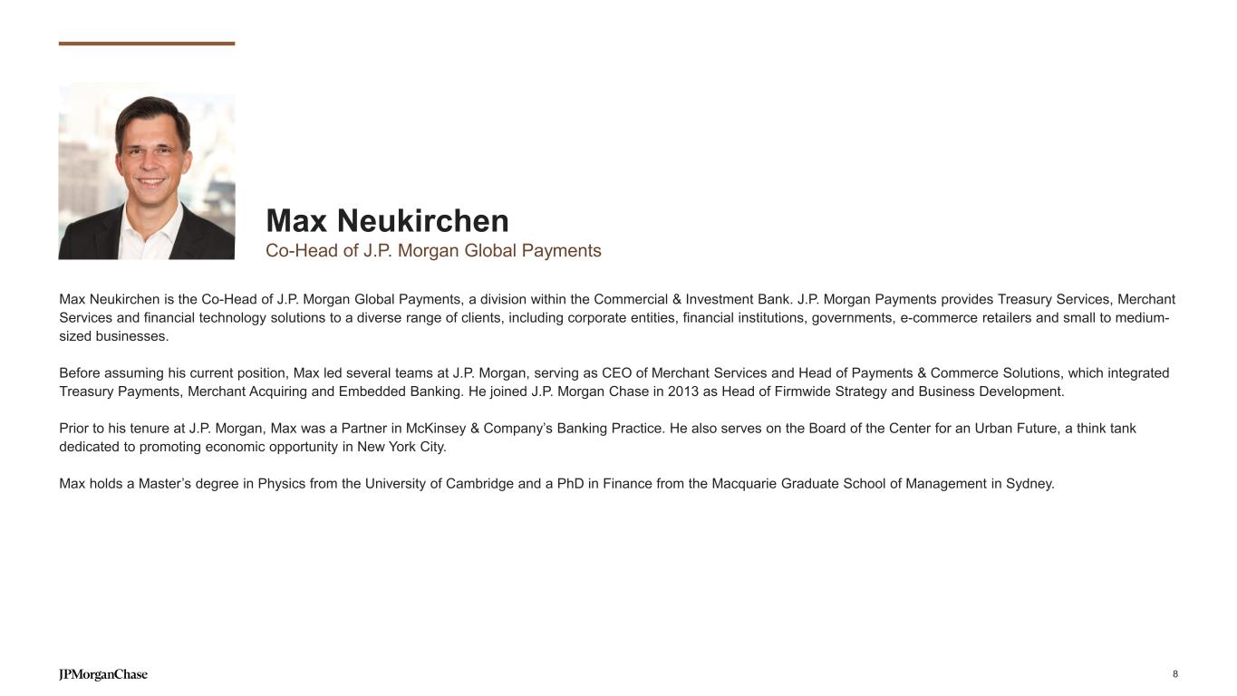 Max Neukirchen is the Co-Head of J.P. Morgan Global Payments, a division within the Commercial & Investment Bank. J.P. Morgan Payments provides Treasury Services, Merchant Services and financial technology solutions to a diverse range of clients, including corporate entities, financial institutions, governments, e-commerce retailers and small to medium- sized businesses. Before assuming his current position, Max led several teams at J.P. Morgan, serving as CEO of Merchant Services and Head of Payments & Commerce Solutions, which integrated Treasury Payments, Merchant Acquiring and Embedded Banking. He joined J.P. Morgan Chase in 2013 as Head of Firmwide Strategy and Business Development. Prior to his tenure at J.P. Morgan, Max was a Partner in McKinsey & Company’s Banking Practice. He also serves on the Board of the Center for an Urban Future, a think tank dedicated to promoting economic opportunity in New York City. Max holds a Master’s degree in Physics from the University of Cambridge and a PhD in Finance from the Macquarie Graduate School of Management in Sydney. Max Neukirchen Co-Head of J.P. Morgan Global Payments 8