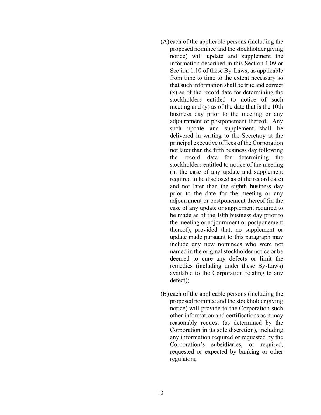 13 (A) each of the applicable persons (including the proposed nominee and the stockholder giving notice) will update and supplement the information described in this Section 1.09 or Section 1.10 of these By-Laws, as applicable from time to time to the extent necessary so that such information shall be true and correct (x) as of the record date for determining the stockholders entitled to notice of such meeting and (y) as of the date that is the 10th business day prior to the meeting or any adjournment or postponement thereof. Any such update and supplement shall be delivered in writing to the Secretary at the principal executive offices of the Corporation not later than the fifth business day following the record date for determining the stockholders entitled to notice of the meeting (in the case of any update and supplement required to be disclosed as of the record date) and not later than the eighth business day prior to the date for the meeting or any adjournment or postponement thereof (in the case of any update or supplement required to be made as of the 10th business day prior to the meeting or adjournment or postponement thereof), provided that, no supplement or update made pursuant to this paragraph may include any new nominees who were not named in the original stockholder notice or be deemed to cure any defects or limit the remedies (including under these By-Laws) available to the Corporation relating to any defect); (B) each of the applicable persons (including the proposed nominee and the stockholder giving notice) will provide to the Corporation such other information and certifications as it may reasonably request (as determined by the Corporation in its sole discretion), including any information required or requested by the Corporation’s subsidiaries, or required, requested or expected by banking or other regulators;