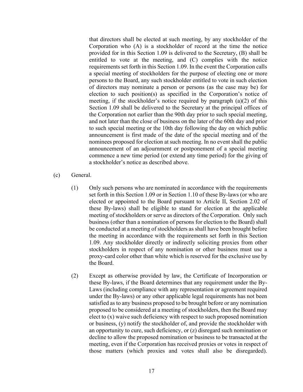 17 that directors shall be elected at such meeting, by any stockholder of the Corporation who (A) is a stockholder of record at the time the notice provided for in this Section 1.09 is delivered to the Secretary, (B) shall be entitled to vote at the meeting, and (C) complies with the notice requirements set forth in this Section 1.09. In the event the Corporation calls a special meeting of stockholders for the purpose of electing one or more persons to the Board, any such stockholder entitled to vote in such election of directors may nominate a person or persons (as the case may be) for election to such position(s) as specified in the Corporation’s notice of meeting, if the stockholder’s notice required by paragraph (a)(2) of this Section 1.09 shall be delivered to the Secretary at the principal offices of the Corporation not earlier than the 90th day prior to such special meeting, and not later than the close of business on the later of the 60th day and prior to such special meeting or the 10th day following the day on which public announcement is first made of the date of the special meeting and of the nominees proposed for election at such meeting. In no event shall the public announcement of an adjournment or postponement of a special meeting commence a new time period (or extend any time period) for the giving of a stockholder’s notice as described above. (c) General. (1) Only such persons who are nominated in accordance with the requirements set forth in this Section 1.09 or in Section 1.10 of these By-laws (or who are elected or appointed to the Board pursuant to Article II, Section 2.02 of these By-laws) shall be eligible to stand for election at the applicable meeting of stockholders or serve as directors of the Corporation. Only such business (other than a nomination of persons for election to the Board) shall be conducted at a meeting of stockholders as shall have been brought before the meeting in accordance with the requirements set forth in this Section 1.09. Any stockholder directly or indirectly soliciting proxies from other stockholders in respect of any nomination or other business must use a proxy-card color other than white which is reserved for the exclusive use by the Board. (2) Except as otherwise provided by law, the Certificate of Incorporation or these By-laws, if the Board determines that any requirement under the By- Laws (including compliance with any representation or agreement required under the By-laws) or any other applicable legal requirements has not been satisfied as to any business proposed to be brought before or any nomination proposed to be considered at a meeting of stockholders, then the Board may elect to (x) waive such deficiency with respect to such proposed nomination or business, (y) notify the stockholder of, and provide the stockholder with an opportunity to cure, such deficiency, or (z) disregard such nomination or decline to allow the proposed nomination or business to be transacted at the meeting, even if the Corporation has received proxies or votes in respect of those matters (which proxies and votes shall also be disregarded).
