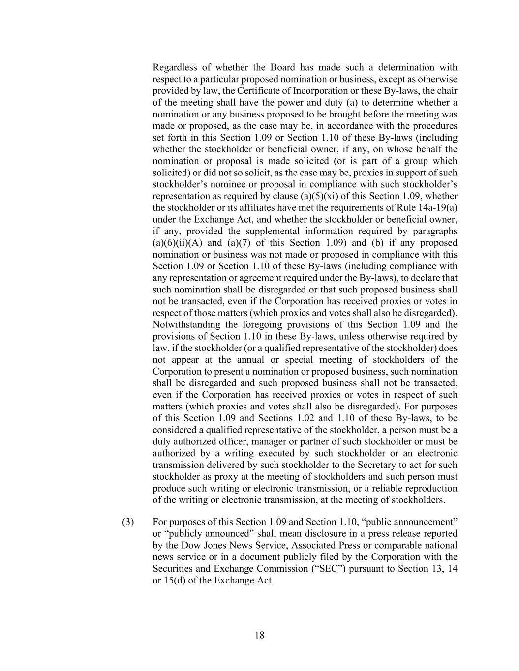 18 Regardless of whether the Board has made such a determination with respect to a particular proposed nomination or business, except as otherwise provided by law, the Certificate of Incorporation or these By-laws, the chair of the meeting shall have the power and duty (a) to determine whether a nomination or any business proposed to be brought before the meeting was made or proposed, as the case may be, in accordance with the procedures set forth in this Section 1.09 or Section 1.10 of these By-laws (including whether the stockholder or beneficial owner, if any, on whose behalf the nomination or proposal is made solicited (or is part of a group which solicited) or did not so solicit, as the case may be, proxies in support of such stockholder’s nominee or proposal in compliance with such stockholder’s representation as required by clause (a)(5)(xi) of this Section 1.09, whether the stockholder or its affiliates have met the requirements of Rule 14a-19(a) under the Exchange Act, and whether the stockholder or beneficial owner, if any, provided the supplemental information required by paragraphs (a)(6)(ii)(A) and (a)(7) of this Section 1.09) and (b) if any proposed nomination or business was not made or proposed in compliance with this Section 1.09 or Section 1.10 of these By-laws (including compliance with any representation or agreement required under the By-laws), to declare that such nomination shall be disregarded or that such proposed business shall not be transacted, even if the Corporation has received proxies or votes in respect of those matters (which proxies and votes shall also be disregarded). Notwithstanding the foregoing provisions of this Section 1.09 and the provisions of Section 1.10 in these By-laws, unless otherwise required by law, if the stockholder (or a qualified representative of the stockholder) does not appear at the annual or special meeting of stockholders of the Corporation to present a nomination or proposed business, such nomination shall be disregarded and such proposed business shall not be transacted, even if the Corporation has received proxies or votes in respect of such matters (which proxies and votes shall also be disregarded). For purposes of this Section 1.09 and Sections 1.02 and 1.10 of these By-laws, to be considered a qualified representative of the stockholder, a person must be a duly authorized officer, manager or partner of such stockholder or must be authorized by a writing executed by such stockholder or an electronic transmission delivered by such stockholder to the Secretary to act for such stockholder as proxy at the meeting of stockholders and such person must produce such writing or electronic transmission, or a reliable reproduction of the writing or electronic transmission, at the meeting of stockholders. (3) For purposes of this Section 1.09 and Section 1.10, “public announcement” or “publicly announced” shall mean disclosure in a press release reported by the Dow Jones News Service, Associated Press or comparable national news service or in a document publicly filed by the Corporation with the Securities and Exchange Commission (“SEC”) pursuant to Section 13, 14 or 15(d) of the Exchange Act.
