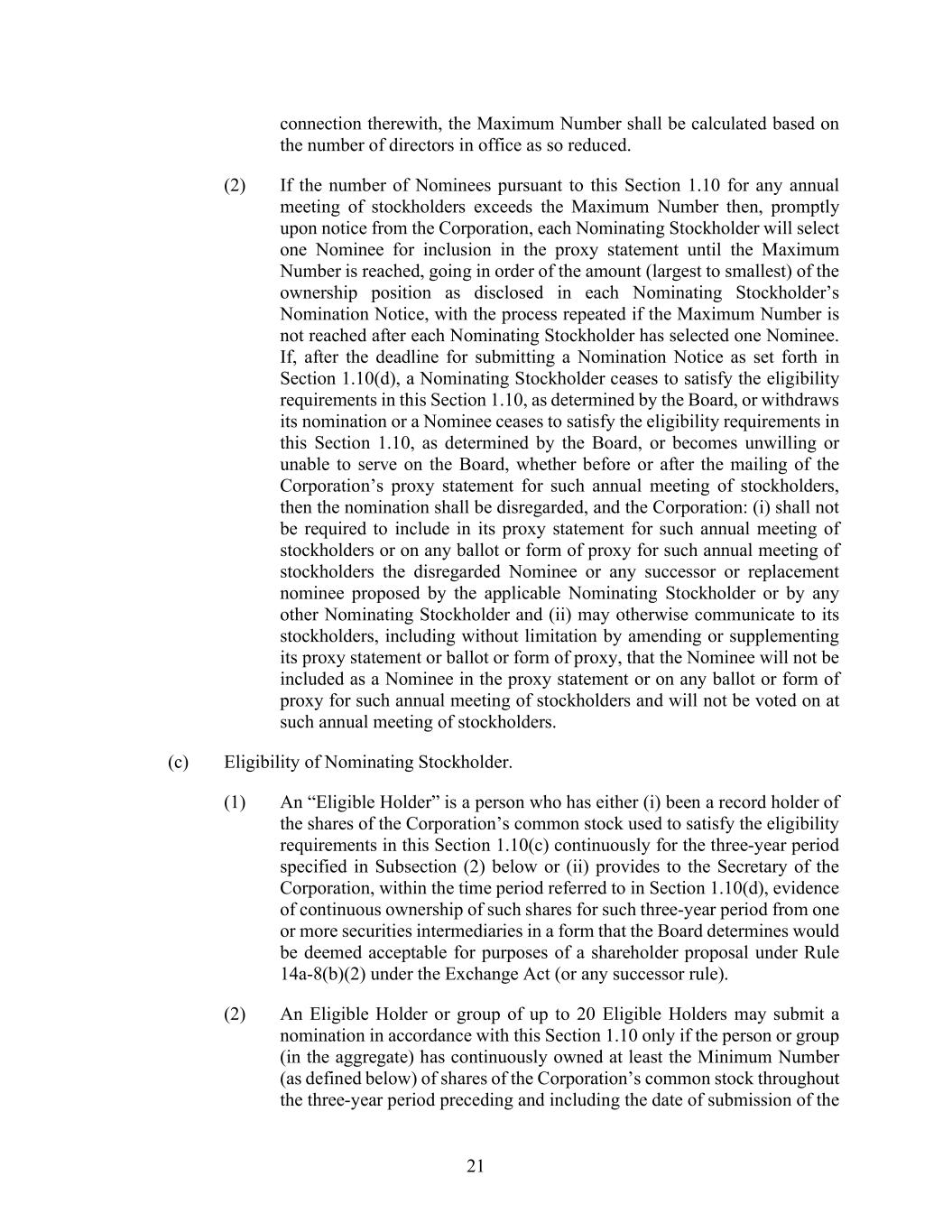 21 connection therewith, the Maximum Number shall be calculated based on the number of directors in office as so reduced. (2) If the number of Nominees pursuant to this Section 1.10 for any annual meeting of stockholders exceeds the Maximum Number then, promptly upon notice from the Corporation, each Nominating Stockholder will select one Nominee for inclusion in the proxy statement until the Maximum Number is reached, going in order of the amount (largest to smallest) of the ownership position as disclosed in each Nominating Stockholder’s Nomination Notice, with the process repeated if the Maximum Number is not reached after each Nominating Stockholder has selected one Nominee. If, after the deadline for submitting a Nomination Notice as set forth in Section 1.10(d), a Nominating Stockholder ceases to satisfy the eligibility requirements in this Section 1.10, as determined by the Board, or withdraws its nomination or a Nominee ceases to satisfy the eligibility requirements in this Section 1.10, as determined by the Board, or becomes unwilling or unable to serve on the Board, whether before or after the mailing of the Corporation’s proxy statement for such annual meeting of stockholders, then the nomination shall be disregarded, and the Corporation: (i) shall not be required to include in its proxy statement for such annual meeting of stockholders or on any ballot or form of proxy for such annual meeting of stockholders the disregarded Nominee or any successor or replacement nominee proposed by the applicable Nominating Stockholder or by any other Nominating Stockholder and (ii) may otherwise communicate to its stockholders, including without limitation by amending or supplementing its proxy statement or ballot or form of proxy, that the Nominee will not be included as a Nominee in the proxy statement or on any ballot or form of proxy for such annual meeting of stockholders and will not be voted on at such annual meeting of stockholders. (c) Eligibility of Nominating Stockholder. (1) An “Eligible Holder” is a person who has either (i) been a record holder of the shares of the Corporation’s common stock used to satisfy the eligibility requirements in this Section 1.10(c) continuously for the three-year period specified in Subsection (2) below or (ii) provides to the Secretary of the Corporation, within the time period referred to in Section 1.10(d), evidence of continuous ownership of such shares for such three-year period from one or more securities intermediaries in a form that the Board determines would be deemed acceptable for purposes of a shareholder proposal under Rule 14a-8(b)(2) under the Exchange Act (or any successor rule). (2) An Eligible Holder or group of up to 20 Eligible Holders may submit a nomination in accordance with this Section 1.10 only if the person or group (in the aggregate) has continuously owned at least the Minimum Number (as defined below) of shares of the Corporation’s common stock throughout the three-year period preceding and including the date of submission of the