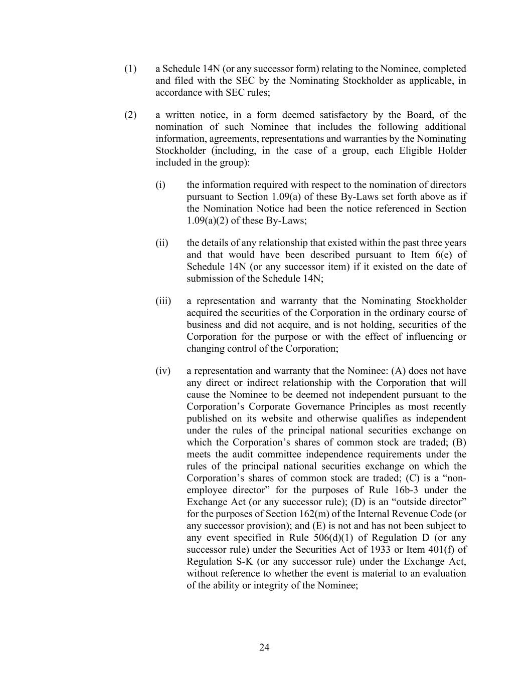 24 (1) a Schedule 14N (or any successor form) relating to the Nominee, completed and filed with the SEC by the Nominating Stockholder as applicable, in accordance with SEC rules; (2) a written notice, in a form deemed satisfactory by the Board, of the nomination of such Nominee that includes the following additional information, agreements, representations and warranties by the Nominating Stockholder (including, in the case of a group, each Eligible Holder included in the group): (i) the information required with respect to the nomination of directors pursuant to Section 1.09(a) of these By-Laws set forth above as if the Nomination Notice had been the notice referenced in Section 1.09(a)(2) of these By-Laws; (ii) the details of any relationship that existed within the past three years and that would have been described pursuant to Item 6(e) of Schedule 14N (or any successor item) if it existed on the date of submission of the Schedule 14N; (iii) a representation and warranty that the Nominating Stockholder acquired the securities of the Corporation in the ordinary course of business and did not acquire, and is not holding, securities of the Corporation for the purpose or with the effect of influencing or changing control of the Corporation; (iv) a representation and warranty that the Nominee: (A) does not have any direct or indirect relationship with the Corporation that will cause the Nominee to be deemed not independent pursuant to the Corporation’s Corporate Governance Principles as most recently published on its website and otherwise qualifies as independent under the rules of the principal national securities exchange on which the Corporation’s shares of common stock are traded; (B) meets the audit committee independence requirements under the rules of the principal national securities exchange on which the Corporation’s shares of common stock are traded; (C) is a “non- employee director” for the purposes of Rule 16b-3 under the Exchange Act (or any successor rule); (D) is an “outside director” for the purposes of Section 162(m) of the Internal Revenue Code (or any successor provision); and (E) is not and has not been subject to any event specified in Rule 506(d)(1) of Regulation D (or any successor rule) under the Securities Act of 1933 or Item 401(f) of Regulation S-K (or any successor rule) under the Exchange Act, without reference to whether the event is material to an evaluation of the ability or integrity of the Nominee;