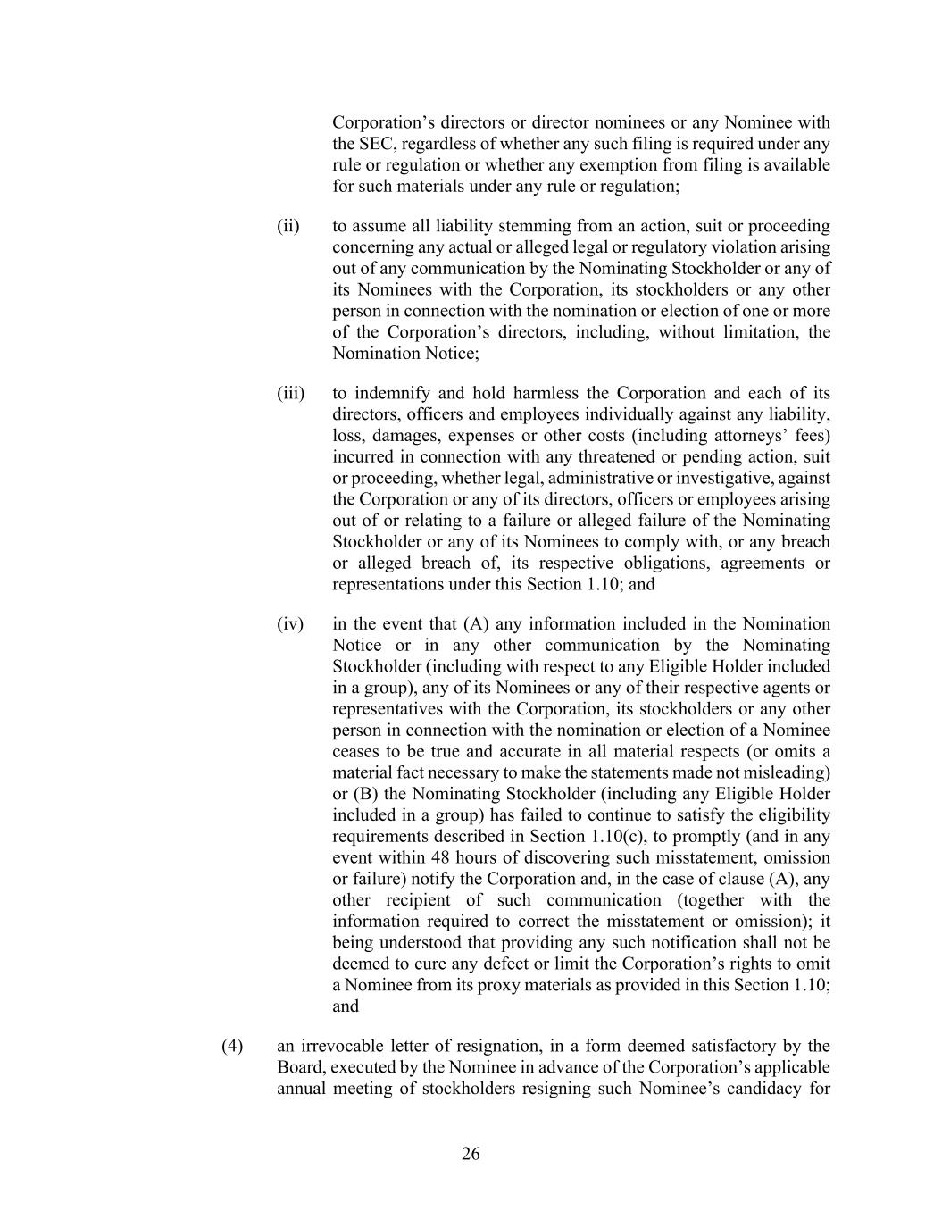 26 Corporation’s directors or director nominees or any Nominee with the SEC, regardless of whether any such filing is required under any rule or regulation or whether any exemption from filing is available for such materials under any rule or regulation; (ii) to assume all liability stemming from an action, suit or proceeding concerning any actual or alleged legal or regulatory violation arising out of any communication by the Nominating Stockholder or any of its Nominees with the Corporation, its stockholders or any other person in connection with the nomination or election of one or more of the Corporation’s directors, including, without limitation, the Nomination Notice; (iii) to indemnify and hold harmless the Corporation and each of its directors, officers and employees individually against any liability, loss, damages, expenses or other costs (including attorneys’ fees) incurred in connection with any threatened or pending action, suit or proceeding, whether legal, administrative or investigative, against the Corporation or any of its directors, officers or employees arising out of or relating to a failure or alleged failure of the Nominating Stockholder or any of its Nominees to comply with, or any breach or alleged breach of, its respective obligations, agreements or representations under this Section 1.10; and (iv) in the event that (A) any information included in the Nomination Notice or in any other communication by the Nominating Stockholder (including with respect to any Eligible Holder included in a group), any of its Nominees or any of their respective agents or representatives with the Corporation, its stockholders or any other person in connection with the nomination or election of a Nominee ceases to be true and accurate in all material respects (or omits a material fact necessary to make the statements made not misleading) or (B) the Nominating Stockholder (including any Eligible Holder included in a group) has failed to continue to satisfy the eligibility requirements described in Section 1.10(c), to promptly (and in any event within 48 hours of discovering such misstatement, omission or failure) notify the Corporation and, in the case of clause (A), any other recipient of such communication (together with the information required to correct the misstatement or omission); it being understood that providing any such notification shall not be deemed to cure any defect or limit the Corporation’s rights to omit a Nominee from its proxy materials as provided in this Section 1.10; and (4) an irrevocable letter of resignation, in a form deemed satisfactory by the Board, executed by the Nominee in advance of the Corporation’s applicable annual meeting of stockholders resigning such Nominee’s candidacy for