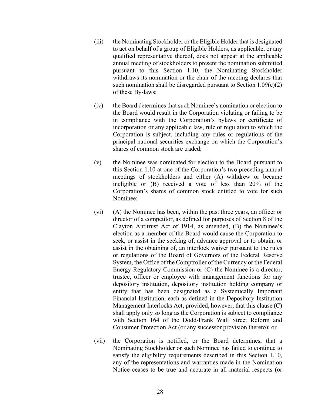 28 (iii) the Nominating Stockholder or the Eligible Holder that is designated to act on behalf of a group of Eligible Holders, as applicable, or any qualified representative thereof, does not appear at the applicable annual meeting of stockholders to present the nomination submitted pursuant to this Section 1.10, the Nominating Stockholder withdraws its nomination or the chair of the meeting declares that such nomination shall be disregarded pursuant to Section 1.09(c)(2) of these By-laws; (iv) the Board determines that such Nominee’s nomination or election to the Board would result in the Corporation violating or failing to be in compliance with the Corporation’s bylaws or certificate of incorporation or any applicable law, rule or regulation to which the Corporation is subject, including any rules or regulations of the principal national securities exchange on which the Corporation’s shares of common stock are traded; (v) the Nominee was nominated for election to the Board pursuant to this Section 1.10 at one of the Corporation’s two preceding annual meetings of stockholders and either (A) withdrew or became ineligible or (B) received a vote of less than 20% of the Corporation’s shares of common stock entitled to vote for such Nominee; (vi) (A) the Nominee has been, within the past three years, an officer or director of a competitor, as defined for purposes of Section 8 of the Clayton Antitrust Act of 1914, as amended, (B) the Nominee’s election as a member of the Board would cause the Corporation to seek, or assist in the seeking of, advance approval or to obtain, or assist in the obtaining of, an interlock waiver pursuant to the rules or regulations of the Board of Governors of the Federal Reserve System, the Office of the Comptroller of the Currency or the Federal Energy Regulatory Commission or (C) the Nominee is a director, trustee, officer or employee with management functions for any depository institution, depository institution holding company or entity that has been designated as a Systemically Important Financial Institution, each as defined in the Depository Institution Management Interlocks Act, provided, however, that this clause (C) shall apply only so long as the Corporation is subject to compliance with Section 164 of the Dodd-Frank Wall Street Reform and Consumer Protection Act (or any successor provision thereto); or (vii) the Corporation is notified, or the Board determines, that a Nominating Stockholder or such Nominee has failed to continue to satisfy the eligibility requirements described in this Section 1.10, any of the representations and warranties made in the Nomination Notice ceases to be true and accurate in all material respects (or