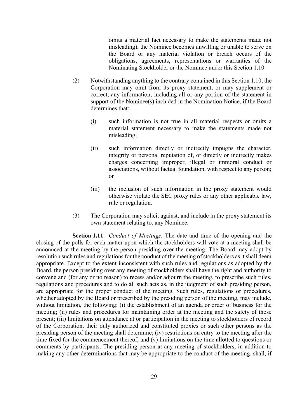 29 omits a material fact necessary to make the statements made not misleading), the Nominee becomes unwilling or unable to serve on the Board or any material violation or breach occurs of the obligations, agreements, representations or warranties of the Nominating Stockholder or the Nominee under this Section 1.10. (2) Notwithstanding anything to the contrary contained in this Section 1.10, the Corporation may omit from its proxy statement, or may supplement or correct, any information, including all or any portion of the statement in support of the Nominee(s) included in the Nomination Notice, if the Board determines that: (i) such information is not true in all material respects or omits a material statement necessary to make the statements made not misleading; (ii) such information directly or indirectly impugns the character, integrity or personal reputation of, or directly or indirectly makes charges concerning improper, illegal or immoral conduct or associations, without factual foundation, with respect to any person; or (iii) the inclusion of such information in the proxy statement would otherwise violate the SEC proxy rules or any other applicable law, rule or regulation. (3) The Corporation may solicit against, and include in the proxy statement its own statement relating to, any Nominee. Section 1.11. Conduct of Meetings. The date and time of the opening and the closing of the polls for each matter upon which the stockholders will vote at a meeting shall be announced at the meeting by the person presiding over the meeting. The Board may adopt by resolution such rules and regulations for the conduct of the meeting of stockholders as it shall deem appropriate. Except to the extent inconsistent with such rules and regulations as adopted by the Board, the person presiding over any meeting of stockholders shall have the right and authority to convene and (for any or no reason) to recess and/or adjourn the meeting, to prescribe such rules, regulations and procedures and to do all such acts as, in the judgment of such presiding person, are appropriate for the proper conduct of the meeting. Such rules, regulations or procedures, whether adopted by the Board or prescribed by the presiding person of the meeting, may include, without limitation, the following: (i) the establishment of an agenda or order of business for the meeting; (ii) rules and procedures for maintaining order at the meeting and the safety of those present; (iii) limitations on attendance at or participation in the meeting to stockholders of record of the Corporation, their duly authorized and constituted proxies or such other persons as the presiding person of the meeting shall determine; (iv) restrictions on entry to the meeting after the time fixed for the commencement thereof; and (v) limitations on the time allotted to questions or comments by participants. The presiding person at any meeting of stockholders, in addition to making any other determinations that may be appropriate to the conduct of the meeting, shall, if