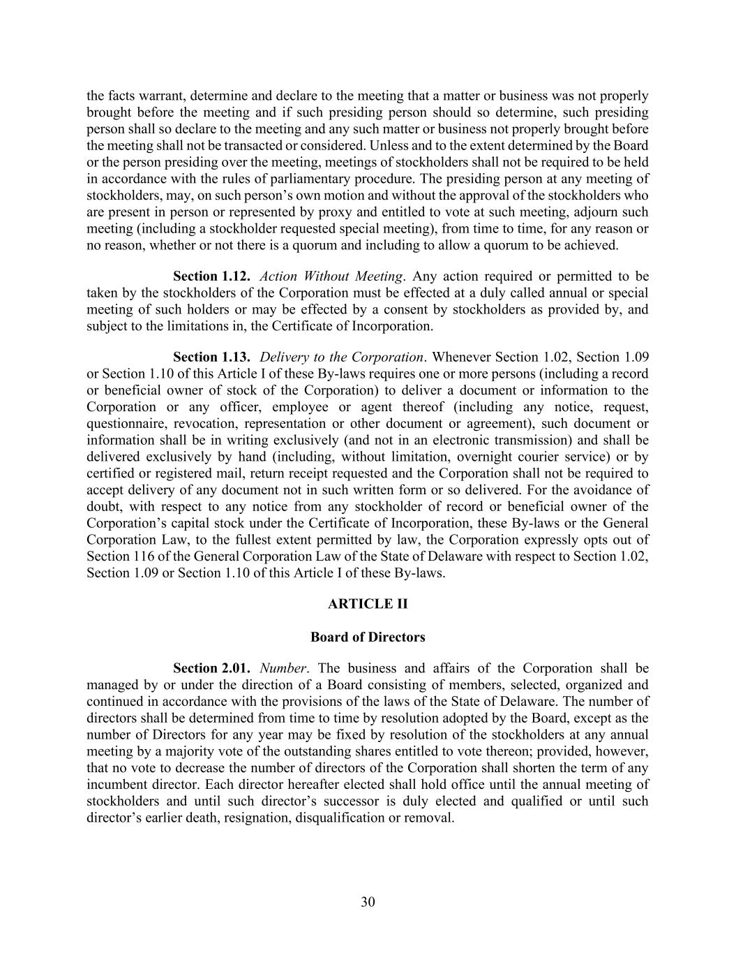 30 the facts warrant, determine and declare to the meeting that a matter or business was not properly brought before the meeting and if such presiding person should so determine, such presiding person shall so declare to the meeting and any such matter or business not properly brought before the meeting shall not be transacted or considered. Unless and to the extent determined by the Board or the person presiding over the meeting, meetings of stockholders shall not be required to be held in accordance with the rules of parliamentary procedure. The presiding person at any meeting of stockholders, may, on such person’s own motion and without the approval of the stockholders who are present in person or represented by proxy and entitled to vote at such meeting, adjourn such meeting (including a stockholder requested special meeting), from time to time, for any reason or no reason, whether or not there is a quorum and including to allow a quorum to be achieved. Section 1.12. Action Without Meeting. Any action required or permitted to be taken by the stockholders of the Corporation must be effected at a duly called annual or special meeting of such holders or may be effected by a consent by stockholders as provided by, and subject to the limitations in, the Certificate of Incorporation. Section 1.13. Delivery to the Corporation. Whenever Section 1.02, Section 1.09 or Section 1.10 of this Article I of these By-laws requires one or more persons (including a record or beneficial owner of stock of the Corporation) to deliver a document or information to the Corporation or any officer, employee or agent thereof (including any notice, request, questionnaire, revocation, representation or other document or agreement), such document or information shall be in writing exclusively (and not in an electronic transmission) and shall be delivered exclusively by hand (including, without limitation, overnight courier service) or by certified or registered mail, return receipt requested and the Corporation shall not be required to accept delivery of any document not in such written form or so delivered. For the avoidance of doubt, with respect to any notice from any stockholder of record or beneficial owner of the Corporation’s capital stock under the Certificate of Incorporation, these By-laws or the General Corporation Law, to the fullest extent permitted by law, the Corporation expressly opts out of Section 116 of the General Corporation Law of the State of Delaware with respect to Section 1.02, Section 1.09 or Section 1.10 of this Article I of these By-laws. ARTICLE II Board of Directors Section 2.01. Number. The business and affairs of the Corporation shall be managed by or under the direction of a Board consisting of members, selected, organized and continued in accordance with the provisions of the laws of the State of Delaware. The number of directors shall be determined from time to time by resolution adopted by the Board, except as the number of Directors for any year may be fixed by resolution of the stockholders at any annual meeting by a majority vote of the outstanding shares entitled to vote thereon; provided, however, that no vote to decrease the number of directors of the Corporation shall shorten the term of any incumbent director. Each director hereafter elected shall hold office until the annual meeting of stockholders and until such director’s successor is duly elected and qualified or until such director’s earlier death, resignation, disqualification or removal.