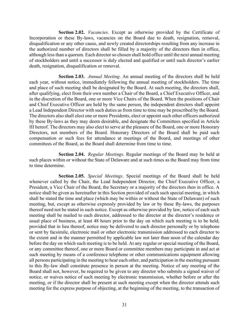 31 Section 2.02. Vacancies. Except as otherwise provided by the Certificate of Incorporation or these By-laws, vacancies on the Board due to death, resignation, removal, disqualification or any other cause, and newly created directorships resulting from any increase in the authorized number of directors shall be filled by a majority of the directors then in office, although less than a quorum. Each director so chosen shall hold office until the next annual meeting of stockholders and until a successor is duly elected and qualified or until such director’s earlier death, resignation, disqualification or removal. Section 2.03. Annual Meeting. An annual meeting of the directors shall be held each year, without notice, immediately following the annual meeting of stockholders. The time and place of such meeting shall be designated by the Board. At such meeting, the directors shall, after qualifying, elect from their own number a Chair of the Board, a Chief Executive Officer, and in the discretion of the Board, one or more Vice Chairs of the Board. When the positions of Chair and Chief Executive Officer are held by the same person, the independent directors shall appoint a Lead Independent Director with such duties as from time to time may be prescribed by the Board. The directors also shall elect one or more Presidents, elect or appoint such other officers authorized by these By-laws as they may deem desirable, and designate the Committees specified in Article III hereof. The directors may also elect to serve at the pleasure of the Board, one or more Honorary Directors, not members of the Board. Honorary Directors of the Board shall be paid such compensation or such fees for attendance at meetings of the Board, and meetings of other committees of the Board, as the Board shall determine from time to time. Section 2.04. Regular Meetings. Regular meetings of the Board may be held at such places within or without the State of Delaware and at such times as the Board may from time to time determine. Section 2.05. Special Meetings. Special meetings of the Board shall be held whenever called by the Chair, the Lead Independent Director, the Chief Executive Officer, a President, a Vice Chair of the Board, the Secretary or a majority of the directors then in office. A notice shall be given as hereinafter in this Section provided of each such special meeting, in which shall be stated the time and place (which may be within or without the State of Delaware) of such meeting, but, except as otherwise expressly provided by law or by these By-laws, the purposes thereof need not be stated in such notice. Except as otherwise provided by law, notice of each such meeting shall be mailed to each director, addressed to the director at the director’s residence or usual place of business, at least 48 hours prior to the day on which such meeting is to be held; provided that in lieu thereof, notice may be delivered to each director personally or by telephone or sent by facsimile, electronic mail or other electronic transmission addressed to each director to the extent and in the manner permitted by applicable law not later than noon of the calendar day before the day on which such meeting is to be held. At any regular or special meeting of the Board, or any committee thereof, one or more Board or committee members may participate in and act at such meeting by means of a conference telephone or other communications equipment allowing all persons participating in the meeting to hear each other, and participation in the meeting pursuant to this By-law shall constitute presence in person at the meeting. Notice of any meeting of the Board shall not, however, be required to be given to any director who submits a signed waiver of notice, or waives notice of such meeting by electronic transmission, whether before or after the meeting, or if the director shall be present at such meeting except when the director attends such meeting for the express purpose of objecting, at the beginning of the meeting, to the transaction of
