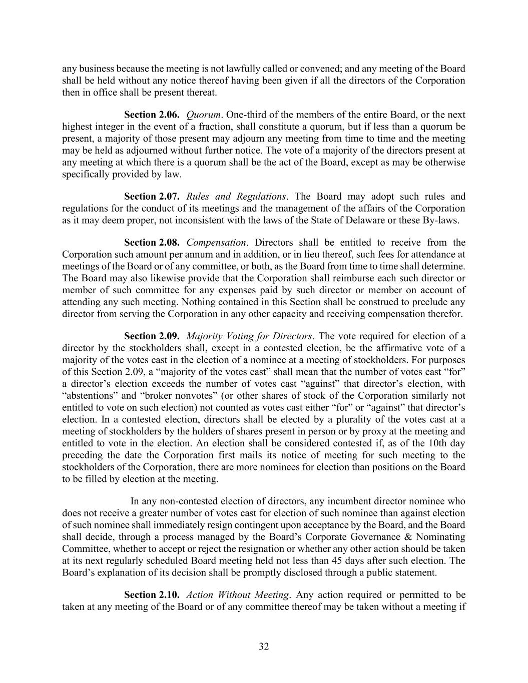 32 any business because the meeting is not lawfully called or convened; and any meeting of the Board shall be held without any notice thereof having been given if all the directors of the Corporation then in office shall be present thereat. Section 2.06. Quorum. One-third of the members of the entire Board, or the next highest integer in the event of a fraction, shall constitute a quorum, but if less than a quorum be present, a majority of those present may adjourn any meeting from time to time and the meeting may be held as adjourned without further notice. The vote of a majority of the directors present at any meeting at which there is a quorum shall be the act of the Board, except as may be otherwise specifically provided by law. Section 2.07. Rules and Regulations. The Board may adopt such rules and regulations for the conduct of its meetings and the management of the affairs of the Corporation as it may deem proper, not inconsistent with the laws of the State of Delaware or these By-laws. Section 2.08. Compensation. Directors shall be entitled to receive from the Corporation such amount per annum and in addition, or in lieu thereof, such fees for attendance at meetings of the Board or of any committee, or both, as the Board from time to time shall determine. The Board may also likewise provide that the Corporation shall reimburse each such director or member of such committee for any expenses paid by such director or member on account of attending any such meeting. Nothing contained in this Section shall be construed to preclude any director from serving the Corporation in any other capacity and receiving compensation therefor. Section 2.09. Majority Voting for Directors. The vote required for election of a director by the stockholders shall, except in a contested election, be the affirmative vote of a majority of the votes cast in the election of a nominee at a meeting of stockholders. For purposes of this Section 2.09, a “majority of the votes cast” shall mean that the number of votes cast “for” a director’s election exceeds the number of votes cast “against” that director’s election, with “abstentions” and “broker nonvotes” (or other shares of stock of the Corporation similarly not entitled to vote on such election) not counted as votes cast either “for” or “against” that director’s election. In a contested election, directors shall be elected by a plurality of the votes cast at a meeting of stockholders by the holders of shares present in person or by proxy at the meeting and entitled to vote in the election. An election shall be considered contested if, as of the 10th day preceding the date the Corporation first mails its notice of meeting for such meeting to the stockholders of the Corporation, there are more nominees for election than positions on the Board to be filled by election at the meeting. In any non-contested election of directors, any incumbent director nominee who does not receive a greater number of votes cast for election of such nominee than against election of such nominee shall immediately resign contingent upon acceptance by the Board, and the Board shall decide, through a process managed by the Board’s Corporate Governance & Nominating Committee, whether to accept or reject the resignation or whether any other action should be taken at its next regularly scheduled Board meeting held not less than 45 days after such election. The Board’s explanation of its decision shall be promptly disclosed through a public statement. Section 2.10. Action Without Meeting. Any action required or permitted to be taken at any meeting of the Board or of any committee thereof may be taken without a meeting if