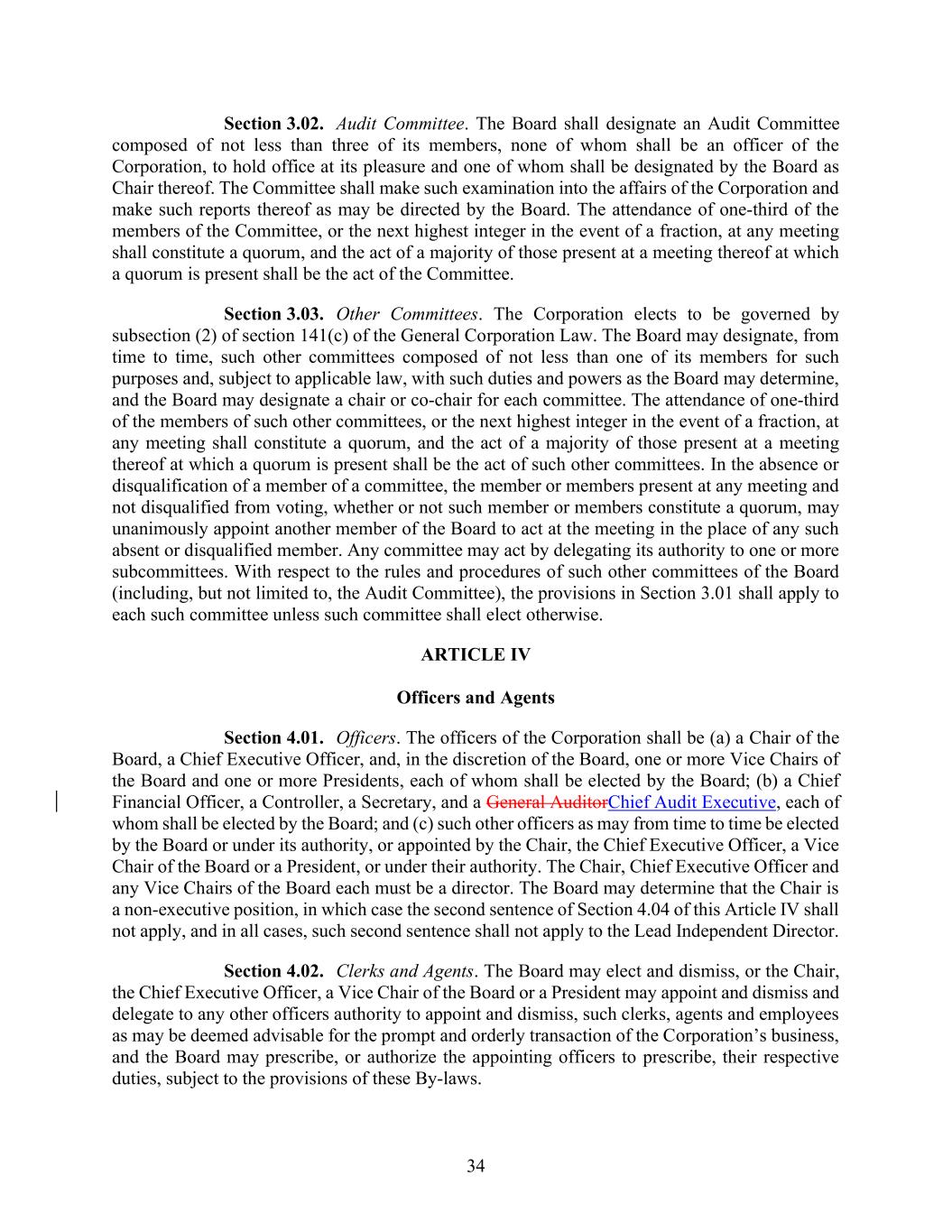 34 Section 3.02. Audit Committee. The Board shall designate an Audit Committee composed of not less than three of its members, none of whom shall be an officer of the Corporation, to hold office at its pleasure and one of whom shall be designated by the Board as Chair thereof. The Committee shall make such examination into the affairs of the Corporation and make such reports thereof as may be directed by the Board. The attendance of one-third of the members of the Committee, or the next highest integer in the event of a fraction, at any meeting shall constitute a quorum, and the act of a majority of those present at a meeting thereof at which a quorum is present shall be the act of the Committee. Section 3.03. Other Committees. The Corporation elects to be governed by subsection (2) of section 141(c) of the General Corporation Law. The Board may designate, from time to time, such other committees composed of not less than one of its members for such purposes and, subject to applicable law, with such duties and powers as the Board may determine, and the Board may designate a chair or co-chair for each committee. The attendance of one-third of the members of such other committees, or the next highest integer in the event of a fraction, at any meeting shall constitute a quorum, and the act of a majority of those present at a meeting thereof at which a quorum is present shall be the act of such other committees. In the absence or disqualification of a member of a committee, the member or members present at any meeting and not disqualified from voting, whether or not such member or members constitute a quorum, may unanimously appoint another member of the Board to act at the meeting in the place of any such absent or disqualified member. Any committee may act by delegating its authority to one or more subcommittees. With respect to the rules and procedures of such other committees of the Board (including, but not limited to, the Audit Committee), the provisions in Section 3.01 shall apply to each such committee unless such committee shall elect otherwise. ARTICLE IV Officers and Agents Section 4.01. Officers. The officers of the Corporation shall be (a) a Chair of the Board, a Chief Executive Officer, and, in the discretion of the Board, one or more Vice Chairs of the Board and one or more Presidents, each of whom shall be elected by the Board; (b) a Chief Financial Officer, a Controller, a Secretary, and a General AuditorChief Audit Executive, each of whom shall be elected by the Board; and (c) such other officers as may from time to time be elected by the Board or under its authority, or appointed by the Chair, the Chief Executive Officer, a Vice Chair of the Board or a President, or under their authority. The Chair, Chief Executive Officer and any Vice Chairs of the Board each must be a director. The Board may determine that the Chair is a non-executive position, in which case the second sentence of Section 4.04 of this Article IV shall not apply, and in all cases, such second sentence shall not apply to the Lead Independent Director. Section 4.02. Clerks and Agents. The Board may elect and dismiss, or the Chair, the Chief Executive Officer, a Vice Chair of the Board or a President may appoint and dismiss and delegate to any other officers authority to appoint and dismiss, such clerks, agents and employees as may be deemed advisable for the prompt and orderly transaction of the Corporation’s business, and the Board may prescribe, or authorize the appointing officers to prescribe, their respective duties, subject to the provisions of these By-laws.