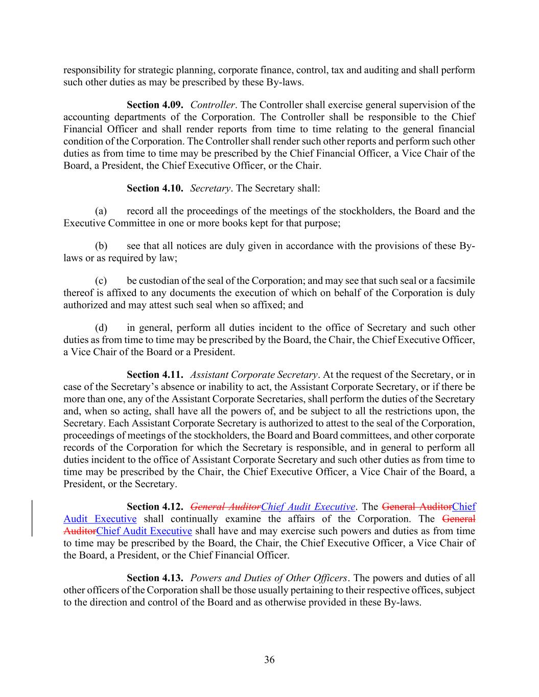 36 responsibility for strategic planning, corporate finance, control, tax and auditing and shall perform such other duties as may be prescribed by these By-laws. Section 4.09. Controller. The Controller shall exercise general supervision of the accounting departments of the Corporation. The Controller shall be responsible to the Chief Financial Officer and shall render reports from time to time relating to the general financial condition of the Corporation. The Controller shall render such other reports and perform such other duties as from time to time may be prescribed by the Chief Financial Officer, a Vice Chair of the Board, a President, the Chief Executive Officer, or the Chair. Section 4.10. Secretary. The Secretary shall: (a) record all the proceedings of the meetings of the stockholders, the Board and the Executive Committee in one or more books kept for that purpose; (b) see that all notices are duly given in accordance with the provisions of these By- laws or as required by law; (c) be custodian of the seal of the Corporation; and may see that such seal or a facsimile thereof is affixed to any documents the execution of which on behalf of the Corporation is duly authorized and may attest such seal when so affixed; and (d) in general, perform all duties incident to the office of Secretary and such other duties as from time to time may be prescribed by the Board, the Chair, the Chief Executive Officer, a Vice Chair of the Board or a President. Section 4.11. Assistant Corporate Secretary. At the request of the Secretary, or in case of the Secretary’s absence or inability to act, the Assistant Corporate Secretary, or if there be more than one, any of the Assistant Corporate Secretaries, shall perform the duties of the Secretary and, when so acting, shall have all the powers of, and be subject to all the restrictions upon, the Secretary. Each Assistant Corporate Secretary is authorized to attest to the seal of the Corporation, proceedings of meetings of the stockholders, the Board and Board committees, and other corporate records of the Corporation for which the Secretary is responsible, and in general to perform all duties incident to the office of Assistant Corporate Secretary and such other duties as from time to time may be prescribed by the Chair, the Chief Executive Officer, a Vice Chair of the Board, a President, or the Secretary. Section 4.12. General AuditorChief Audit Executive. The General AuditorChief Audit Executive shall continually examine the affairs of the Corporation. The General AuditorChief Audit Executive shall have and may exercise such powers and duties as from time to time may be prescribed by the Board, the Chair, the Chief Executive Officer, a Vice Chair of the Board, a President, or the Chief Financial Officer. Section 4.13. Powers and Duties of Other Officers. The powers and duties of all other officers of the Corporation shall be those usually pertaining to their respective offices, subject to the direction and control of the Board and as otherwise provided in these By-laws.