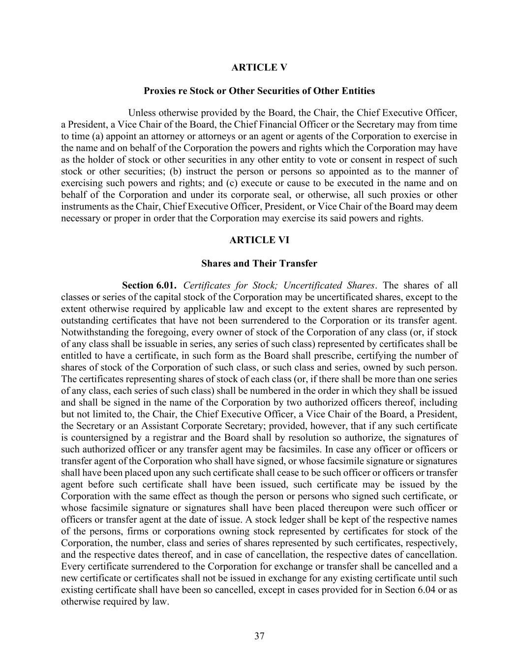 37 ARTICLE V Proxies re Stock or Other Securities of Other Entities Unless otherwise provided by the Board, the Chair, the Chief Executive Officer, a President, a Vice Chair of the Board, the Chief Financial Officer or the Secretary may from time to time (a) appoint an attorney or attorneys or an agent or agents of the Corporation to exercise in the name and on behalf of the Corporation the powers and rights which the Corporation may have as the holder of stock or other securities in any other entity to vote or consent in respect of such stock or other securities; (b) instruct the person or persons so appointed as to the manner of exercising such powers and rights; and (c) execute or cause to be executed in the name and on behalf of the Corporation and under its corporate seal, or otherwise, all such proxies or other instruments as the Chair, Chief Executive Officer, President, or Vice Chair of the Board may deem necessary or proper in order that the Corporation may exercise its said powers and rights. ARTICLE VI Shares and Their Transfer Section 6.01. Certificates for Stock; Uncertificated Shares. The shares of all classes or series of the capital stock of the Corporation may be uncertificated shares, except to the extent otherwise required by applicable law and except to the extent shares are represented by outstanding certificates that have not been surrendered to the Corporation or its transfer agent. Notwithstanding the foregoing, every owner of stock of the Corporation of any class (or, if stock of any class shall be issuable in series, any series of such class) represented by certificates shall be entitled to have a certificate, in such form as the Board shall prescribe, certifying the number of shares of stock of the Corporation of such class, or such class and series, owned by such person. The certificates representing shares of stock of each class (or, if there shall be more than one series of any class, each series of such class) shall be numbered in the order in which they shall be issued and shall be signed in the name of the Corporation by two authorized officers thereof, including but not limited to, the Chair, the Chief Executive Officer, a Vice Chair of the Board, a President, the Secretary or an Assistant Corporate Secretary; provided, however, that if any such certificate is countersigned by a registrar and the Board shall by resolution so authorize, the signatures of such authorized officer or any transfer agent may be facsimiles. In case any officer or officers or transfer agent of the Corporation who shall have signed, or whose facsimile signature or signatures shall have been placed upon any such certificate shall cease to be such officer or officers or transfer agent before such certificate shall have been issued, such certificate may be issued by the Corporation with the same effect as though the person or persons who signed such certificate, or whose facsimile signature or signatures shall have been placed thereupon were such officer or officers or transfer agent at the date of issue. A stock ledger shall be kept of the respective names of the persons, firms or corporations owning stock represented by certificates for stock of the Corporation, the number, class and series of shares represented by such certificates, respectively, and the respective dates thereof, and in case of cancellation, the respective dates of cancellation. Every certificate surrendered to the Corporation for exchange or transfer shall be cancelled and a new certificate or certificates shall not be issued in exchange for any existing certificate until such existing certificate shall have been so cancelled, except in cases provided for in Section 6.04 or as otherwise required by law.