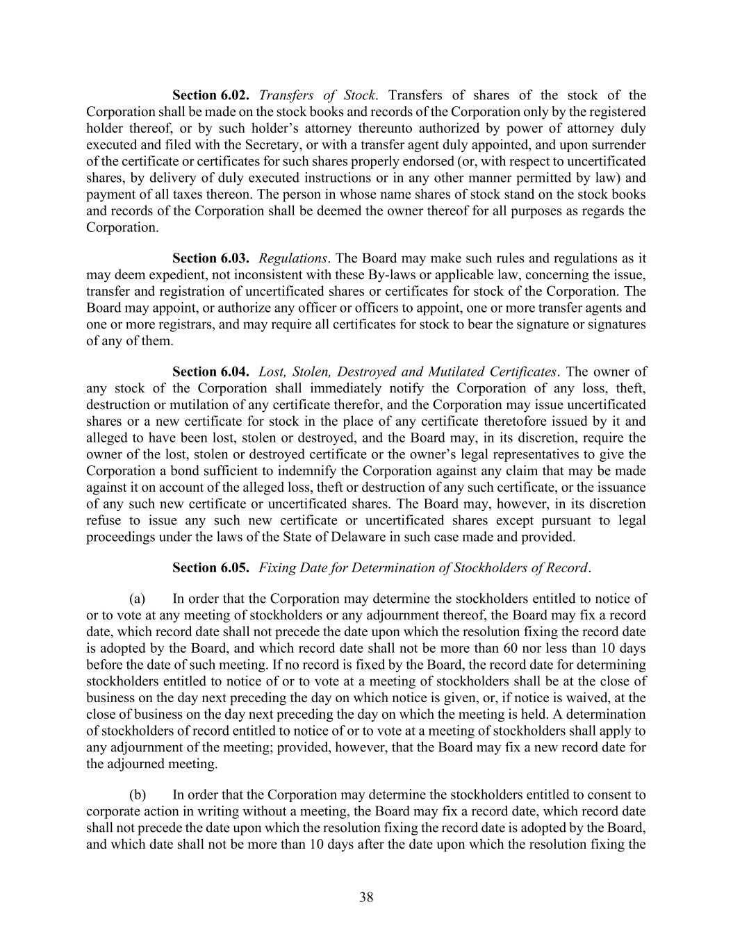 38 Section 6.02. Transfers of Stock. Transfers of shares of the stock of the Corporation shall be made on the stock books and records of the Corporation only by the registered holder thereof, or by such holder’s attorney thereunto authorized by power of attorney duly executed and filed with the Secretary, or with a transfer agent duly appointed, and upon surrender of the certificate or certificates for such shares properly endorsed (or, with respect to uncertificated shares, by delivery of duly executed instructions or in any other manner permitted by law) and payment of all taxes thereon. The person in whose name shares of stock stand on the stock books and records of the Corporation shall be deemed the owner thereof for all purposes as regards the Corporation. Section 6.03. Regulations. The Board may make such rules and regulations as it may deem expedient, not inconsistent with these By-laws or applicable law, concerning the issue, transfer and registration of uncertificated shares or certificates for stock of the Corporation. The Board may appoint, or authorize any officer or officers to appoint, one or more transfer agents and one or more registrars, and may require all certificates for stock to bear the signature or signatures of any of them. Section 6.04. Lost, Stolen, Destroyed and Mutilated Certificates. The owner of any stock of the Corporation shall immediately notify the Corporation of any loss, theft, destruction or mutilation of any certificate therefor, and the Corporation may issue uncertificated shares or a new certificate for stock in the place of any certificate theretofore issued by it and alleged to have been lost, stolen or destroyed, and the Board may, in its discretion, require the owner of the lost, stolen or destroyed certificate or the owner’s legal representatives to give the Corporation a bond sufficient to indemnify the Corporation against any claim that may be made against it on account of the alleged loss, theft or destruction of any such certificate, or the issuance of any such new certificate or uncertificated shares. The Board may, however, in its discretion refuse to issue any such new certificate or uncertificated shares except pursuant to legal proceedings under the laws of the State of Delaware in such case made and provided. Section 6.05. Fixing Date for Determination of Stockholders of Record. (a) In order that the Corporation may determine the stockholders entitled to notice of or to vote at any meeting of stockholders or any adjournment thereof, the Board may fix a record date, which record date shall not precede the date upon which the resolution fixing the record date is adopted by the Board, and which record date shall not be more than 60 nor less than 10 days before the date of such meeting. If no record is fixed by the Board, the record date for determining stockholders entitled to notice of or to vote at a meeting of stockholders shall be at the close of business on the day next preceding the day on which notice is given, or, if notice is waived, at the close of business on the day next preceding the day on which the meeting is held. A determination of stockholders of record entitled to notice of or to vote at a meeting of stockholders shall apply to any adjournment of the meeting; provided, however, that the Board may fix a new record date for the adjourned meeting. (b) In order that the Corporation may determine the stockholders entitled to consent to corporate action in writing without a meeting, the Board may fix a record date, which record date shall not precede the date upon which the resolution fixing the record date is adopted by the Board, and which date shall not be more than 10 days after the date upon which the resolution fixing the