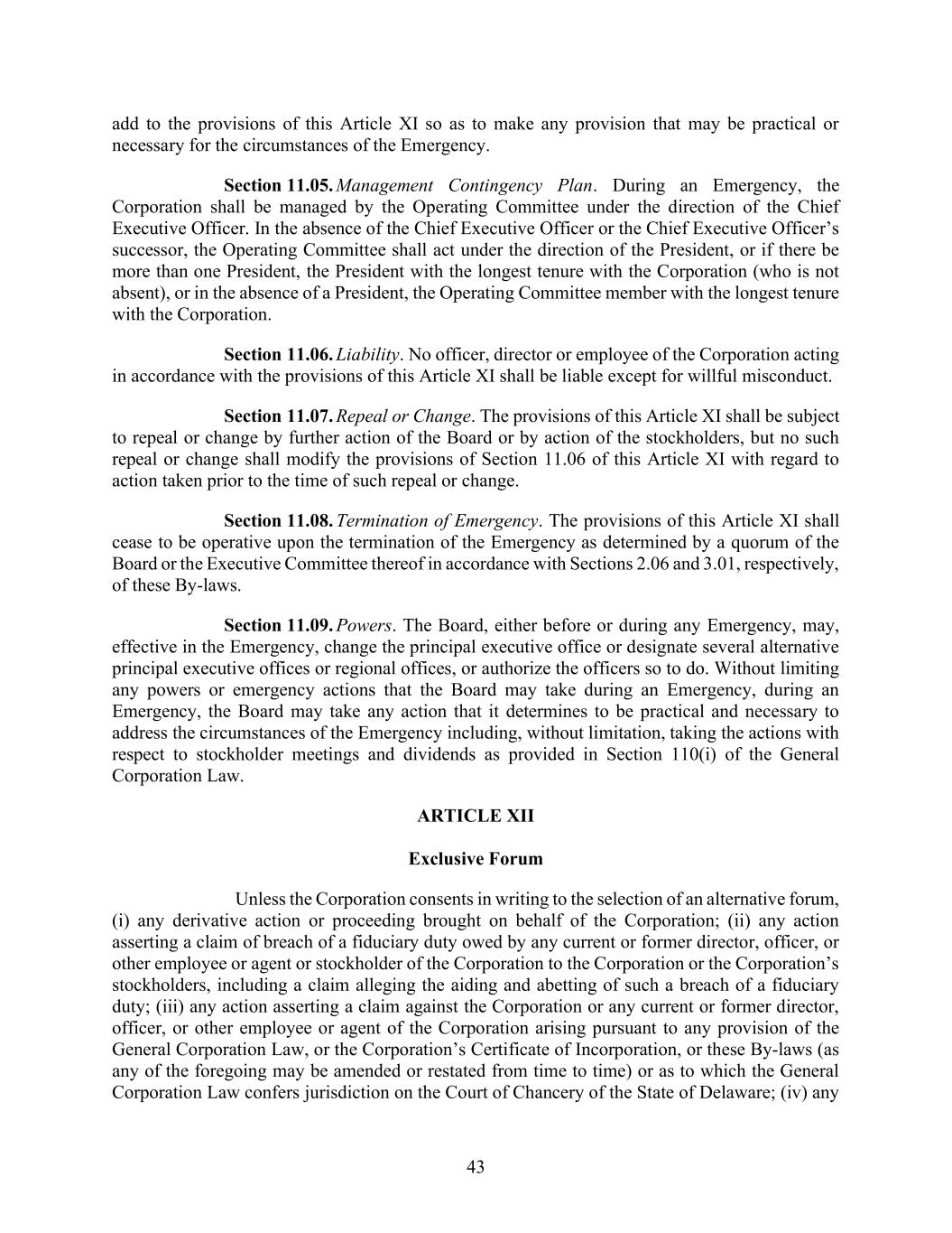 43 add to the provisions of this Article XI so as to make any provision that may be practical or necessary for the circumstances of the Emergency. Section 11.05. Management Contingency Plan. During an Emergency, the Corporation shall be managed by the Operating Committee under the direction of the Chief Executive Officer. In the absence of the Chief Executive Officer or the Chief Executive Officer’s successor, the Operating Committee shall act under the direction of the President, or if there be more than one President, the President with the longest tenure with the Corporation (who is not absent), or in the absence of a President, the Operating Committee member with the longest tenure with the Corporation. Section 11.06. Liability. No officer, director or employee of the Corporation acting in accordance with the provisions of this Article XI shall be liable except for willful misconduct. Section 11.07. Repeal or Change. The provisions of this Article XI shall be subject to repeal or change by further action of the Board or by action of the stockholders, but no such repeal or change shall modify the provisions of Section 11.06 of this Article XI with regard to action taken prior to the time of such repeal or change. Section 11.08. Termination of Emergency. The provisions of this Article XI shall cease to be operative upon the termination of the Emergency as determined by a quorum of the Board or the Executive Committee thereof in accordance with Sections 2.06 and 3.01, respectively, of these By-laws. Section 11.09. Powers. The Board, either before or during any Emergency, may, effective in the Emergency, change the principal executive office or designate several alternative principal executive offices or regional offices, or authorize the officers so to do. Without limiting any powers or emergency actions that the Board may take during an Emergency, during an Emergency, the Board may take any action that it determines to be practical and necessary to address the circumstances of the Emergency including, without limitation, taking the actions with respect to stockholder meetings and dividends as provided in Section 110(i) of the General Corporation Law. ARTICLE XII Exclusive Forum Unless the Corporation consents in writing to the selection of an alternative forum, (i) any derivative action or proceeding brought on behalf of the Corporation; (ii) any action asserting a claim of breach of a fiduciary duty owed by any current or former director, officer, or other employee or agent or stockholder of the Corporation to the Corporation or the Corporation’s stockholders, including a claim alleging the aiding and abetting of such a breach of a fiduciary duty; (iii) any action asserting a claim against the Corporation or any current or former director, officer, or other employee or agent of the Corporation arising pursuant to any provision of the General Corporation Law, or the Corporation’s Certificate of Incorporation, or these By-laws (as any of the foregoing may be amended or restated from time to time) or as to which the General Corporation Law confers jurisdiction on the Court of Chancery of the State of Delaware; (iv) any