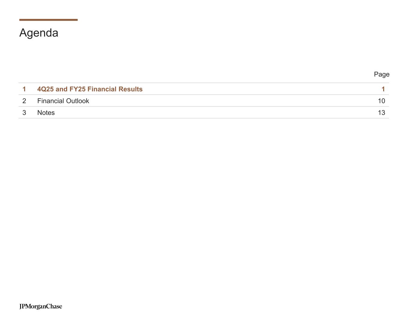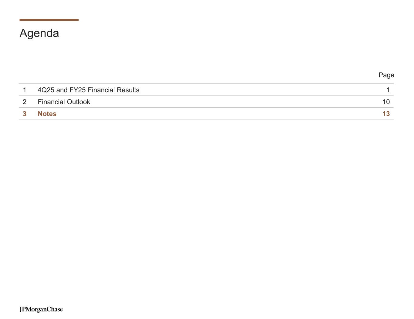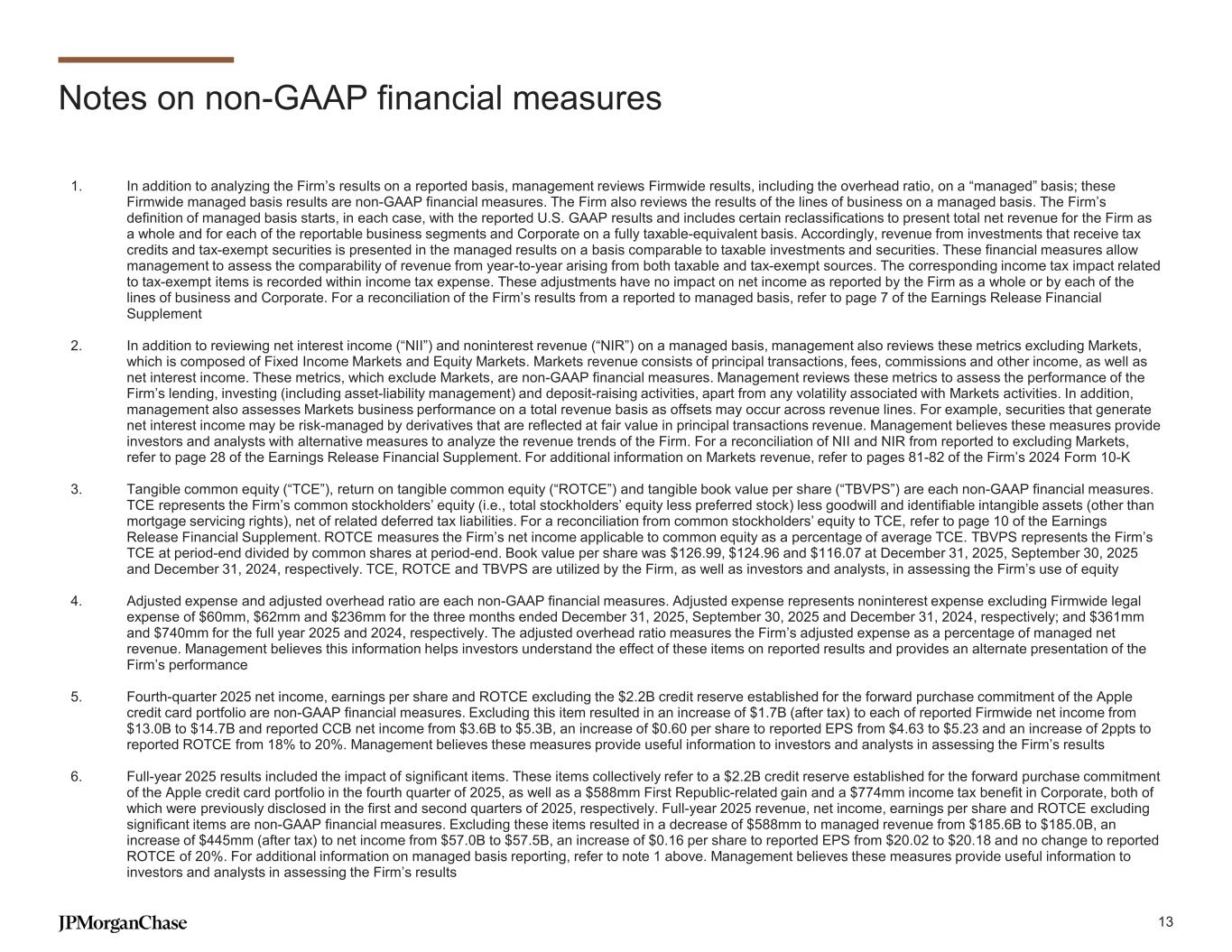 Notes on non-GAAP financial measures 1. In addition to analyzing the Firm’s results on a reported basis, management reviews Firmwide results, including the overhead ratio, on a “managed” basis; these Firmwide managed basis results are non-GAAP financial measures. The Firm also reviews the results of the lines of business on a managed basis. The Firm’s definition of managed basis starts, in each case, with the reported U.S. GAAP results and includes certain reclassifications to present total net revenue for the Firm as a whole and for each of the reportable business segments and Corporate on a fully taxable-equivalent basis. Accordingly, revenue from investments that receive tax credits and tax-exempt securities is presented in the managed results on a basis comparable to taxable investments and securities. These financial measures allow management to assess the comparability of revenue from year-to-year arising from both taxable and tax-exempt sources. The corresponding income tax impact related to tax-exempt items is recorded within income tax expense. These adjustments have no impact on net income as reported by the Firm as a whole or by each of the lines of business and Corporate. For a reconciliation of the Firm’s results from a reported to managed basis, refer to page 7 of the Earnings Release Financial Supplement 2. In addition to reviewing net interest income (“NII”) and noninterest revenue (“NIR”) on a managed basis, management also reviews these metrics excluding Markets, which is composed of Fixed Income Markets and Equity Markets. Markets revenue consists of principal transactions, fees, commissions and other income, as well as net interest income. These metrics, which exclude Markets, are non-GAAP financial measures. Management reviews these metrics to assess the performance of the Firm’s lending, investing (including asset-liability management) and deposit-raising activities, apart from any volatility associated with Markets activities. In addition, management also assesses Markets business performance on a total revenue basis as offsets may occur across revenue lines. For example, securities that generate net interest income may be risk-managed by derivatives that are reflected at fair value in principal transactions revenue. Management believes these measures provide investors and analysts with alternative measures to analyze the revenue trends of the Firm. For a reconciliation of NII and NIR from reported to excluding Markets, refer to page 28 of the Earnings Release Financial Supplement. For additional information on Markets revenue, refer to pages 81-82 of the Firm’s 2024 Form 10-K 3. Tangible common equity (“TCE”), return on tangible common equity (“ROTCE”) and tangible book value per share (“TBVPS”) are each non-GAAP financial measures. TCE represents the Firm’s common stockholders’ equity (i.e., total stockholders’ equity less preferred stock) less goodwill and identifiable intangible assets (other than mortgage servicing rights), net of related deferred tax liabilities. For a reconciliation from common stockholders’ equity to TCE, refer to page 10 of the Earnings Release Financial Supplement. ROTCE measures the Firm’s net income applicable to common equity as a percentage of average TCE. TBVPS represents the Firm’s TCE at period-end divided by common shares at period-end. Book value per share was $126.99, $124.96 and $116.07 at December 31, 2025, September 30, 2025 and December 31, 2024, respectively. TCE, ROTCE and TBVPS are utilized by the Firm, as well as investors and analysts, in assessing the Firm’s use of equity 4. Adjusted expense and adjusted overhead ratio are each non-GAAP financial measures. Adjusted expense represents noninterest expense excluding Firmwide legal expense of $60mm, $62mm and $236mm for the three months ended December 31, 2025, September 30, 2025 and December 31, 2024, respectively; and $361mm and $740mm for the full year 2025 and 2024, respectively. The adjusted overhead ratio measures the Firm’s adjusted expense as a percentage of managed net revenue. Management believes this information helps investors understand the effect of these items on reported results and provides an alternate presentation of the Firm’s performance 5. Fourth-quarter 2025 net income, earnings per share and ROTCE excluding the $2.2B credit reserve established for the forward purchase commitment of the Apple credit card portfolio are non-GAAP financial measures. Excluding this item resulted in an increase of $1.7B (after tax) to each of reported Firmwide net income from $13.0B to $14.7B and reported CCB net income from $3.6B to $5.3B, an increase of $0.60 per share to reported EPS from $4.63 to $5.23 and an increase of 2ppts to reported ROTCE from 18% to 20%. Management believes these measures provide useful information to investors and analysts in assessing the Firm’s results 6. Full-year 2025 results included the impact of significant items. These items collectively refer to a $2.2B credit reserve established for the forward purchase commitment of the Apple credit card portfolio in the fourth quarter of 2025, as well as a $588mm First Republic-related gain and a $774mm income tax benefit in Corporate, both of which were previously disclosed in the first and second quarters of 2025, respectively. Full-year 2025 revenue, net income, earnings per share and ROTCE excluding significant items are non-GAAP financial measures. Excluding these items resulted in a decrease of $588mm to managed revenue from $185.6B to $185.0B, an increase of $445mm (after tax) to net income from $57.0B to $57.5B, an increase of $0.16 per share to reported EPS from $20.02 to $20.18 and no change to reported ROTCE of 20%. For additional information on managed basis reporting, refer to note 1 above. Management believes these measures provide useful information to investors and analysts in assessing the Firm’s results 13