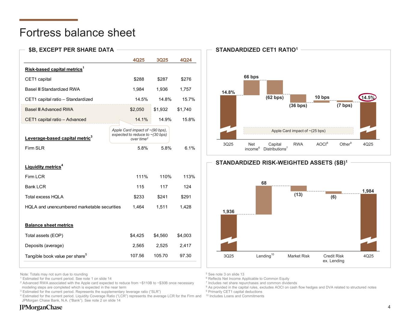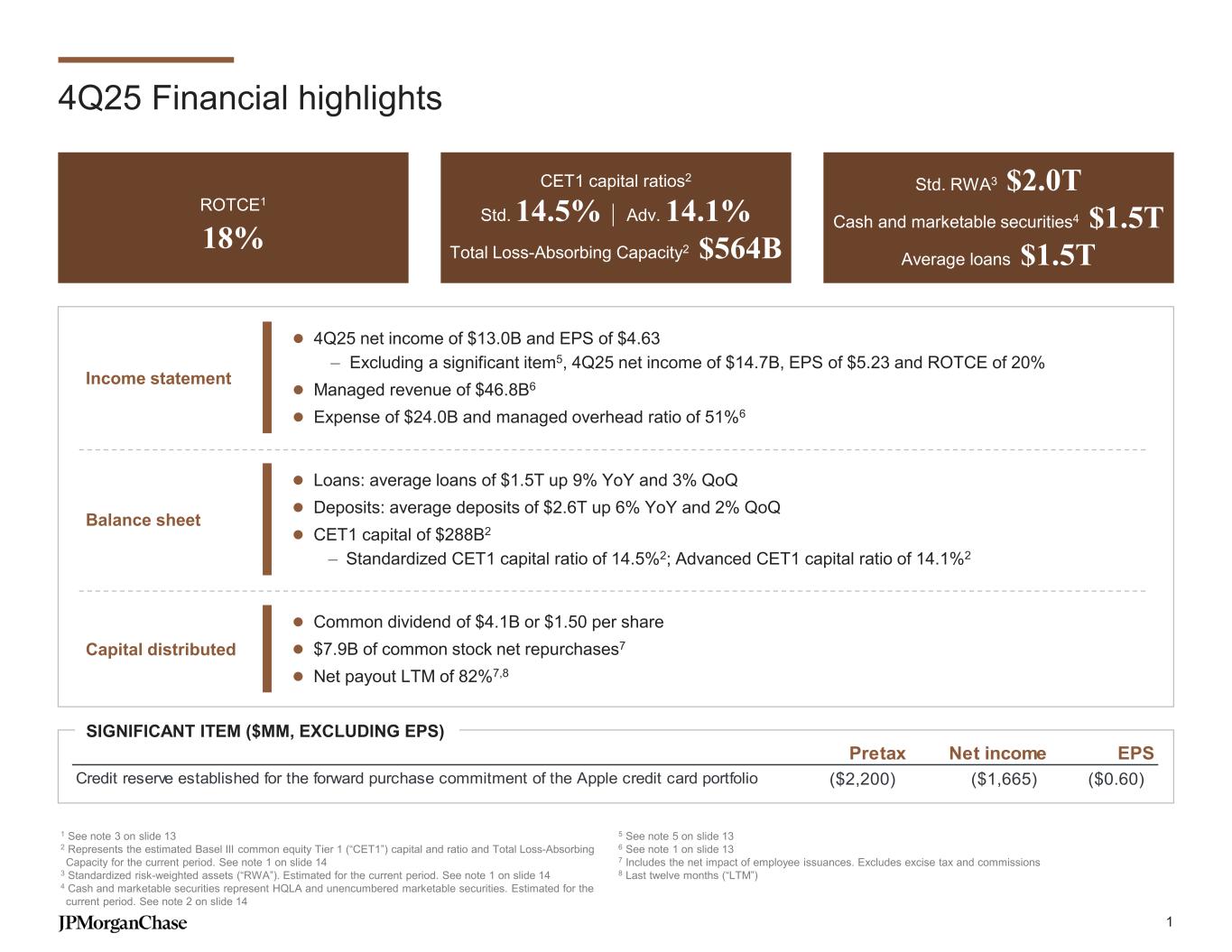 4Q25 Financial highlights ROTCE1 18% CET1 capital ratios2 Std. 14.5% | Adv. 14.1% Total Loss-Absorbing Capacity2 $564B Std. RWA3 $2.0T Cash and marketable securities4 $1.5T Average loans $1.5T Balance sheet  Loans: average loans of $1.5T up 9% YoY and 3% QoQ  Deposits: average deposits of $2.6T up 6% YoY and 2% QoQ  CET1 capital of $288B2 – Standardized CET1 capital ratio of 14.5%2; Advanced CET1 capital ratio of 14.1%2 Capital distributed  Common dividend of $4.1B or $1.50 per share  $7.9B of common stock net repurchases7  Net payout LTM of 82%7,8 Income statement  4Q25 net income of $13.0B and EPS of $4.63 – Excluding a significant item5, 4Q25 net income of $14.7B, EPS of $5.23 and ROTCE of 20%  Managed revenue of $46.8B6  Expense of $24.0B and managed overhead ratio of 51%6 SIGNIFICANT ITEM ($MM, EXCLUDING EPS) 1 See note 3 on slide 13 2 Represents the estimated Basel III common equity Tier 1 (“CET1”) capital and ratio and Total Loss-Absorbing Capacity for the current period. See note 1 on slide 14 3 Standardized risk-weighted assets (“RWA”). Estimated for the current period. See note 1 on slide 14 4 Cash and marketable securities represent HQLA and unencumbered marketable securities. Estimated for the current period. See note 2 on slide 14 5 See note 5 on slide 13 6 See note 1 on slide 13 7 Includes the net impact of employee issuances. Excludes excise tax and commissions 8 Last twelve months (“LTM”) Pretax Net income EPS Credit reserve established for the forward purchase commitment of the Apple credit card portfolio ($2,200) ($1,665) ($0.60) 1