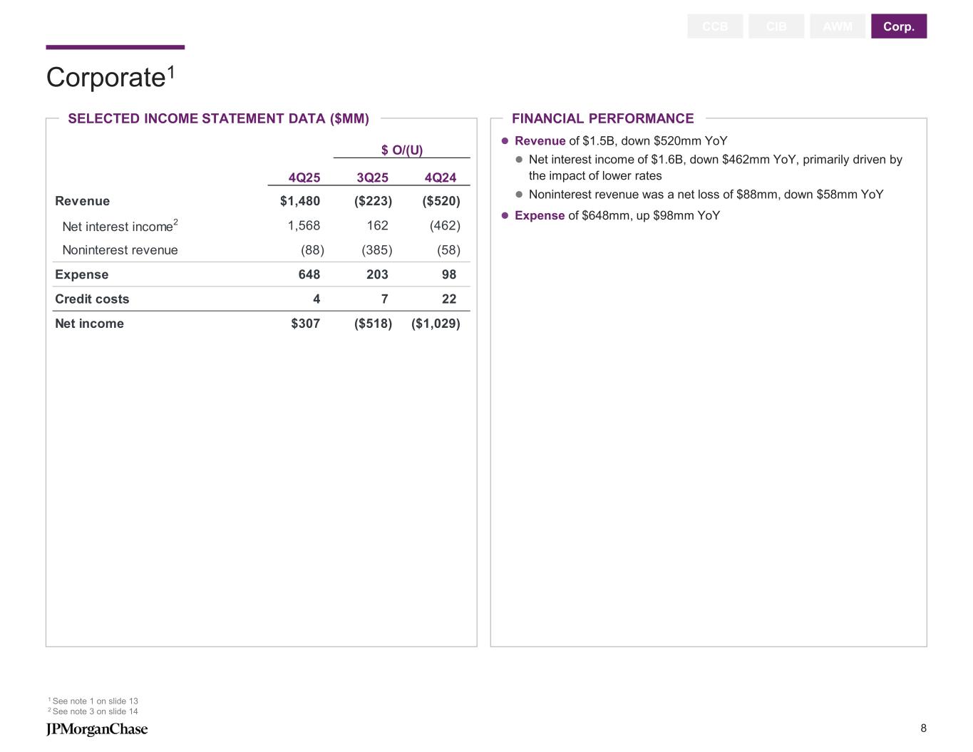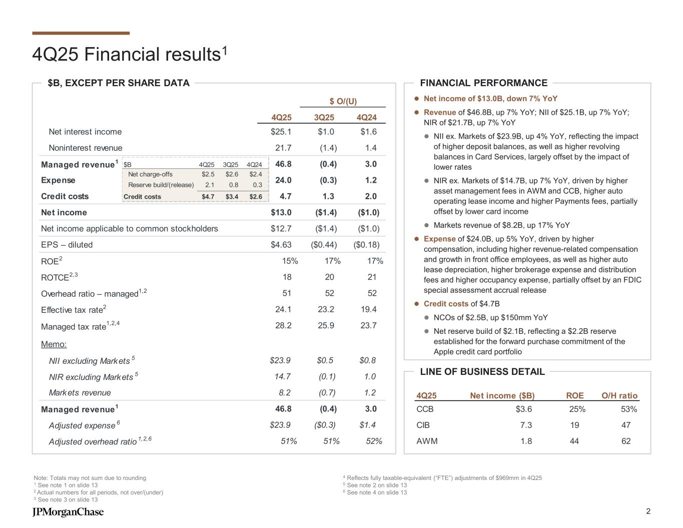 4Q25 Financial results1 Note: Totals may not sum due to rounding 1 See note 1 on slide 13 2 Actual numbers for all periods, not over/(under) 3 See note 3 on slide 13 4 Reflects fully taxable-equivalent (“FTE”) adjustments of $969mm in 4Q25 5 See note 2 on slide 13 6 See note 4 on slide 13 FINANCIAL PERFORMANCE LINE OF BUSINESS DETAIL $B, EXCEPT PER SHARE DATA $B 4Q25 3Q25 4Q24 Net charge-offs $2.5 $2.6 $2.4 Reserve build/(release) 2.1 0.8 0.3 Credit costs $4.7 $3.4 $2.6  Net income of $13.0B, down 7% YoY  Revenue of $46.8B, up 7% YoY; NII of $25.1B, up 7% YoY; NIR of $21.7B, up 7% YoY  NII ex. Markets of $23.9B, up 4% YoY, reflecting the impact of higher deposit balances, as well as higher revolving balances in Card Services, largely offset by the impact of lower rates  NIR ex. Markets of $14.7B, up 7% YoY, driven by higher asset management fees in AWM and CCB, higher auto operating lease income and higher Payments fees, partially offset by lower card income  Markets revenue of $8.2B, up 17% YoY  Expense of $24.0B, up 5% YoY, driven by higher compensation, including higher revenue-related compensation and growth in front office employees, as well as higher auto lease depreciation, higher brokerage expense and distribution fees and higher occupancy expense, partially offset by an FDIC special assessment accrual release  Credit costs of $4.7B  NCOs of $2.5B, up $150mm YoY  Net reserve build of $2.1B, reflecting a $2.2B reserve established for the forward purchase commitment of the Apple credit card portfolio 4Q25 3Q25 4Q24 Net interest income $25.1 $1.0 $1.6 Noninterest revenue 21.7 (1.4) 1.4 Managed revenue1 46.8 (0.4) 3.0 Expense 24.0 (0.3) 1.2 Credit costs 4.7 1.3 2.0 Net income $13.0 ($1.4) ($1.0) Net income applicable to common stockholders $12.7 ($1.4) ($1.0) EPS – diluted $4.63 ($0.44) ($0.18) ROE2 15% 17% 17% ROTCE2,3 18 20 21 Overhead ratio – managed1,2 51 52 52 Effective tax rate2 24.1 23.2 19.4 Managed tax rate1,2,4 28.2 25.9 23.7 Memo: NII excluding Markets 5 $23.9 $0.5 $0.8 NIR excluding Markets 5 14.7 (0.1) 1.0 Markets revenue 8.2 (0.7) 1.2 Managed revenue1 46.8 (0.4) 3.0 Adjusted expense 6 $23.9 ($0.3) $1.4 Adjusted overhead ratio 1,2,6 51% 51% 52% $ O/(U) 4Q25 Net income ($B) ROE O/H ratio CCB $3.6 25% 53% CIB 7.3 19 47 AWM 1.8 44 62 2