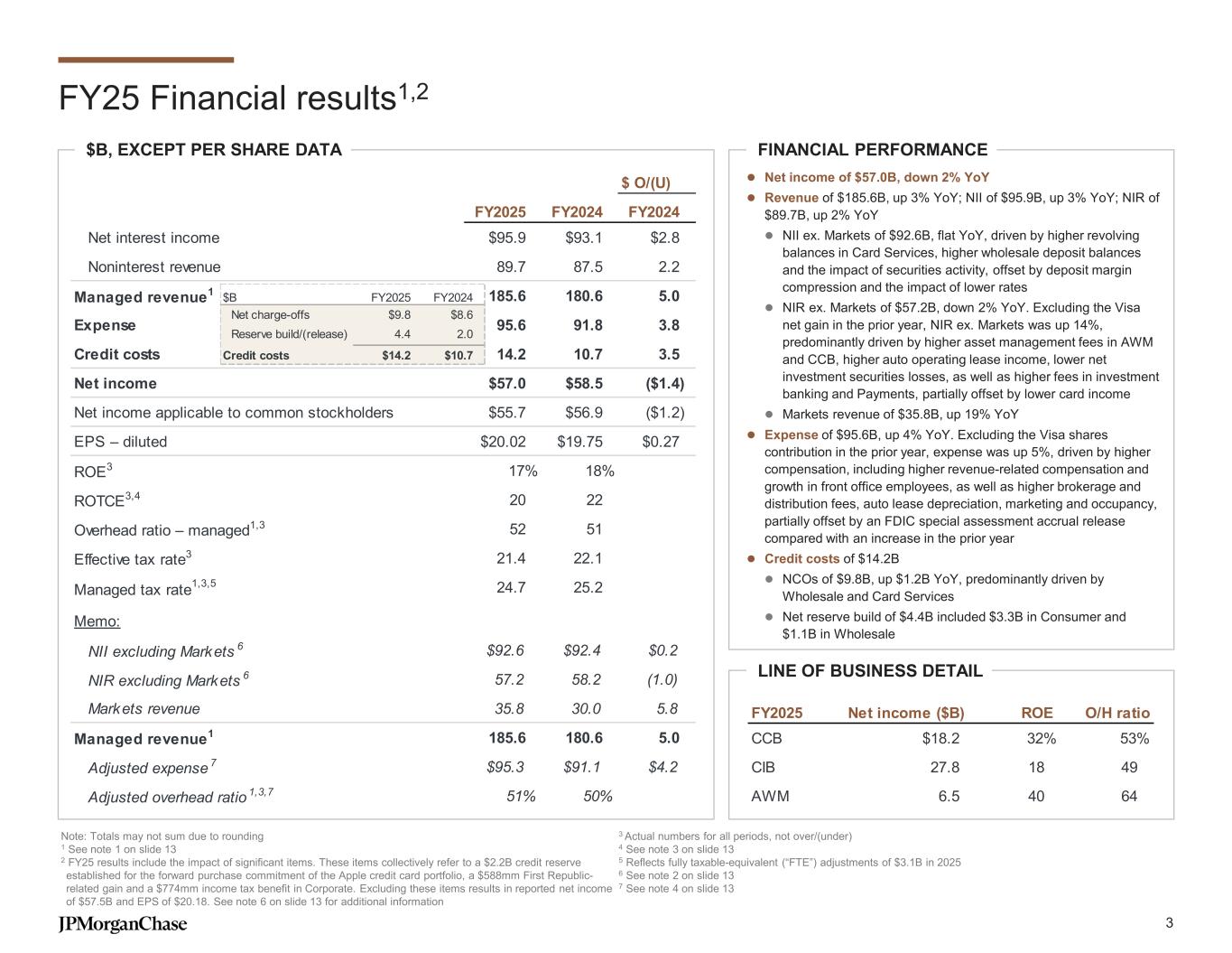 $ O/(U) FY2025 FY2024 FY2024 Net interest income $95.9 $93.1 $2.8 Noninterest revenue 89.7 87.5 2.2 Managed revenue1 185.6 180.6 5.0 Expense 95.6 91.8 3.8 Credit costs 14.2 10.7 3.5 Net income $57.0 $58.5 ($1.4) Net income applicable to common stockholders $55.7 $56.9 ($1.2) EPS – diluted $20.02 $19.75 $0.27 ROE3 17% 18% ROTCE3,4 20 22 Overhead ratio – managed1,3 52 51 Effective tax rate3 21.4 22.1 Managed tax rate1,3,5 24.7 25.2 Memo: NII excluding Markets 6 $92.6 $92.4 $0.2 NIR excluding Markets 6 57.2 58.2 (1.0) Markets revenue 35.8 30.0 5.8 Managed revenue1 185.6 180.6 5.0 Adjusted expense 7 $95.3 $91.1 $4.2 Adjusted overhead ratio 1,3,7 51% 50% FY25 Financial results1,2 Note: Totals may not sum due to rounding 1 See note 1 on slide 13 2 FY25 results include the impact of significant items. These items collectively refer to a $2.2B credit reserve established for the forward purchase commitment of the Apple credit card portfolio, a $588mm First Republic- related gain and a $774mm income tax benefit in Corporate. Excluding these items results in reported net income of $57.5B and EPS of $20.18. See note 6 on slide 13 for additional information 3 Actual numbers for all periods, not over/(under) 4 See note 3 on slide 13 5 Reflects fully taxable-equivalent (“FTE”) adjustments of $3.1B in 2025 6 See note 2 on slide 13 7 See note 4 on slide 13 FINANCIAL PERFORMANCE  Net income of $57.0B, down 2% YoY  Revenue of $185.6B, up 3% YoY; NII of $95.9B, up 3% YoY; NIR of $89.7B, up 2% YoY  NII ex. Markets of $92.6B, flat YoY, driven by higher revolving balances in Card Services, higher wholesale deposit balances and the impact of securities activity, offset by deposit margin compression and the impact of lower rates  NIR ex. Markets of $57.2B, down 2% YoY. Excluding the Visa net gain in the prior year, NIR ex. Markets was up 14%, predominantly driven by higher asset management fees in AWM and CCB, higher auto operating lease income, lower net investment securities losses, as well as higher fees in investment banking and Payments, partially offset by lower card income  Markets revenue of $35.8B, up 19% YoY  Expense of $95.6B, up 4% YoY. Excluding the Visa shares contribution in the prior year, expense was up 5%, driven by higher compensation, including higher revenue-related compensation and growth in front office employees, as well as higher brokerage and distribution fees, auto lease depreciation, marketing and occupancy, partially offset by an FDIC special assessment accrual release compared with an increase in the prior year  Credit costs of $14.2B  NCOs of $9.8B, up $1.2B YoY, predominantly driven by Wholesale and Card Services  Net reserve build of $4.4B included $3.3B in Consumer and $1.1B in Wholesale LINE OF BUSINESS DETAIL $B, EXCEPT PER SHARE DATA $B FY2025 FY2024 Net charge-offs $9.8 $8.6 Reserve build/(release) 4.4 2.0 Credit costs $14.2 $10.7 FY2025 Net income ($B) ROE O/H ratio CCB $18.2 32% 53% CIB 27.8 18 49 AWM 6.5 40 64 3