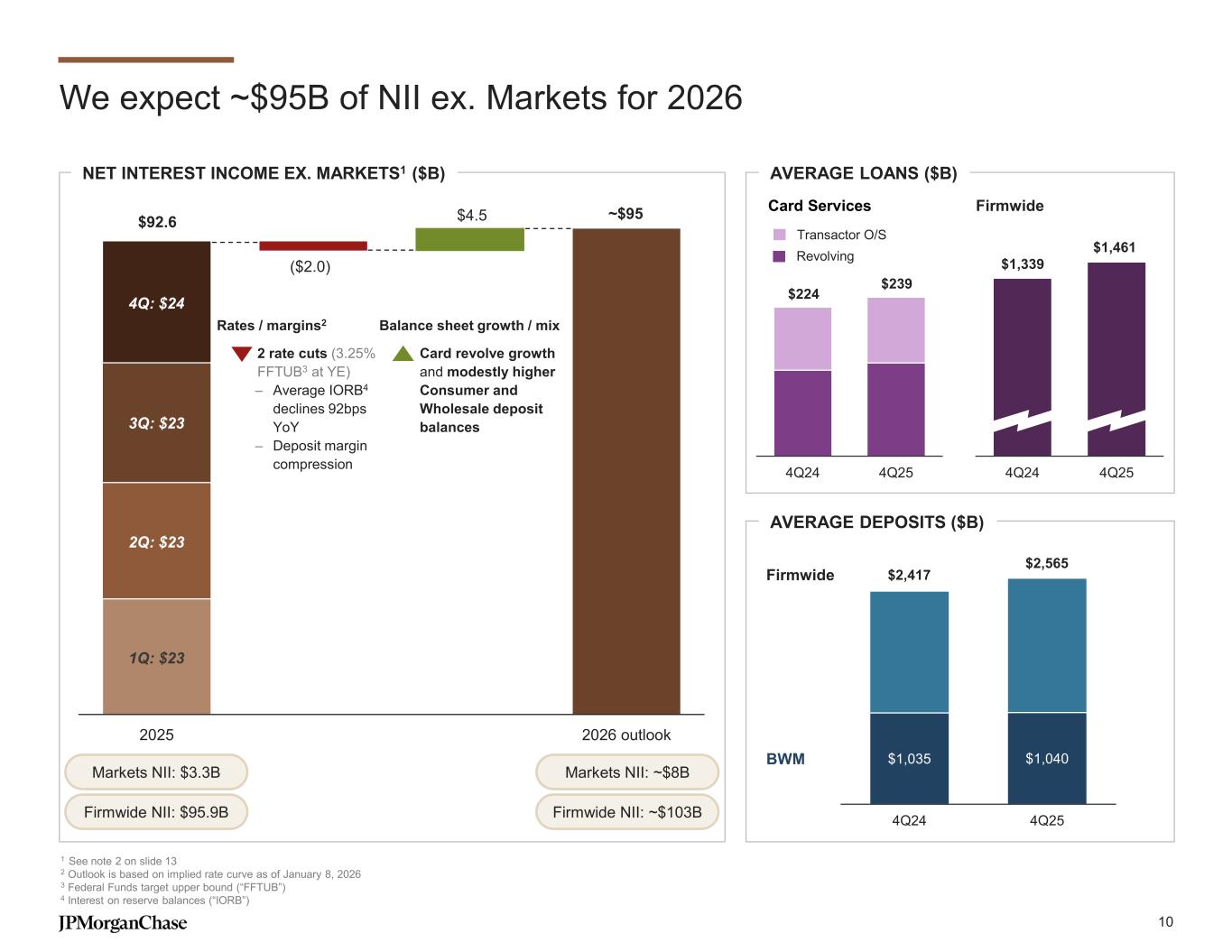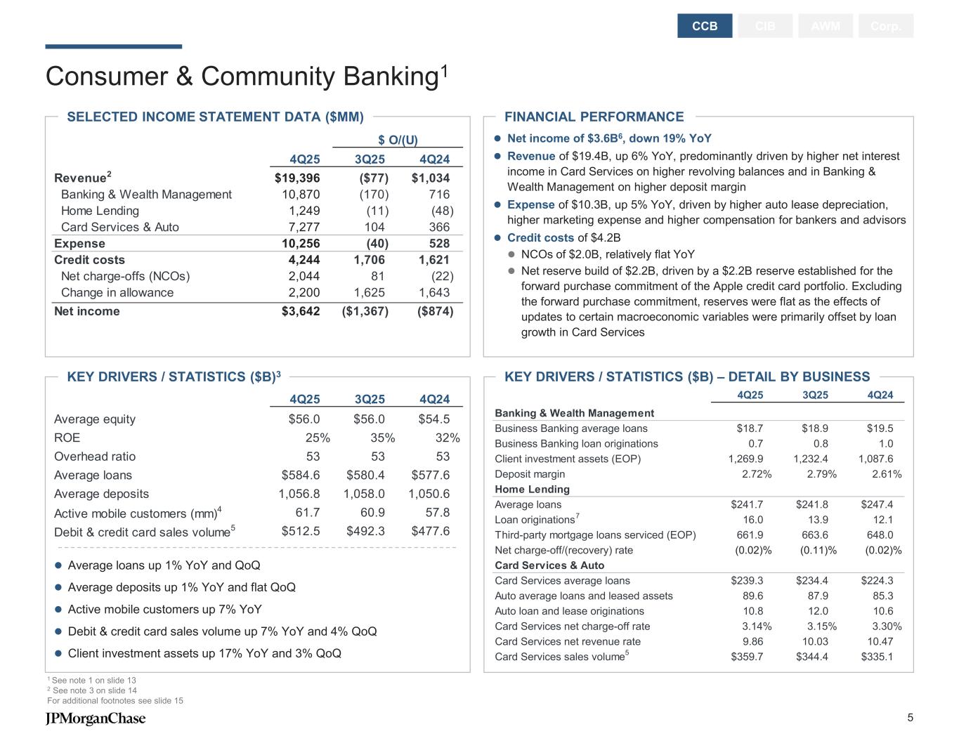 Consumer & Community Banking1 CIB AWM Corp.CCB  Average loans up 1% YoY and QoQ  Average deposits up 1% YoY and flat QoQ  Active mobile customers up 7% YoY  Debit & credit card sales volume up 7% YoY and 4% QoQ  Client investment assets up 17% YoY and 3% QoQ KEY DRIVERS / STATISTICS ($B) – DETAIL BY BUSINESS FINANCIAL PERFORMANCESELECTED INCOME STATEMENT DATA ($MM) KEY DRIVERS / STATISTICS ($B)3  Net income of $3.6B6, down 19% YoY  Revenue of $19.4B, up 6% YoY, predominantly driven by higher net interest income in Card Services on higher revolving balances and in Banking & Wealth Management on higher deposit margin  Expense of $10.3B, up 5% YoY, driven by higher auto lease depreciation, higher marketing expense and higher compensation for bankers and advisors  Credit costs of $4.2B  NCOs of $2.0B, relatively flat YoY  Net reserve build of $2.2B, driven by a $2.2B reserve established for the forward purchase commitment of the Apple credit card portfolio. Excluding the forward purchase commitment, reserves were flat as the effects of updates to certain macroeconomic variables were primarily offset by loan growth in Card Services 1 See note 1 on slide 13 2 See note 3 on slide 14 For additional footnotes see slide 15 $ O/(U) 4Q25 3Q25 4Q24 Revenue $19,396 ($77) $1,034 Banking & Wealth Management 10,870 (170) 716 Home Lending 1,249 (11) (48) Card Services & Auto 7,277 104 366 Expense 10,256 (40) 528 Credit costs 4,244 1,706 1,621 Net charge-offs (NCOs) 2,044 81 (22) Change in allowance 2,200 1,625 1,643 Net income $3,642 ($1,367) ($874) 2 4Q25 3Q25 4Q24 Average equity $56.0 $56.0 $54.5 ROE 25% 35% 32% Overhead ratio 53 53 53 Average loans $584.6 $580.4 $577.6 Average deposits 1,056.8 1,058.0 1,050.6 Active mobile customers (mm)4 61.7 60.9 57.8 Debit & credit card sales volume5 $512.5 $492.3 $477.6 4Q25 3Q25 4Q24 Banking & Wealth Management Business Banking average loans $18.7 $18.9 $19.5 Business Banking loan originations 0.7 0.8 1.0 Client investment assets (EOP) 1,269.9 1,232.4 1,087.6 Deposit margin 2.72% 2.79% 2.61% Home Lending Average loans $241.7 $241.8 $247.4 Loan originations 16.0 13.9 12.1 Third-party mortgage loans serviced (EOP) 661.9 663.6 648.0 Net charge-off/(recovery) rate (0.02)% (0.11)% (0.02)% Card Services & Auto Card Services average loans $239.3 $234.4 $224.3 Auto average loans and leased assets 89.6 87.9 85.3 Auto loan and lease originations 10.8 12.0 10.6 Card Services net charge-off rate 3.14% 3.15% 3.30% Card Services net revenue rate 9.86 10.03 10.47 Card Services sales volume $359.7 $344.4 $335.1 7 5 5