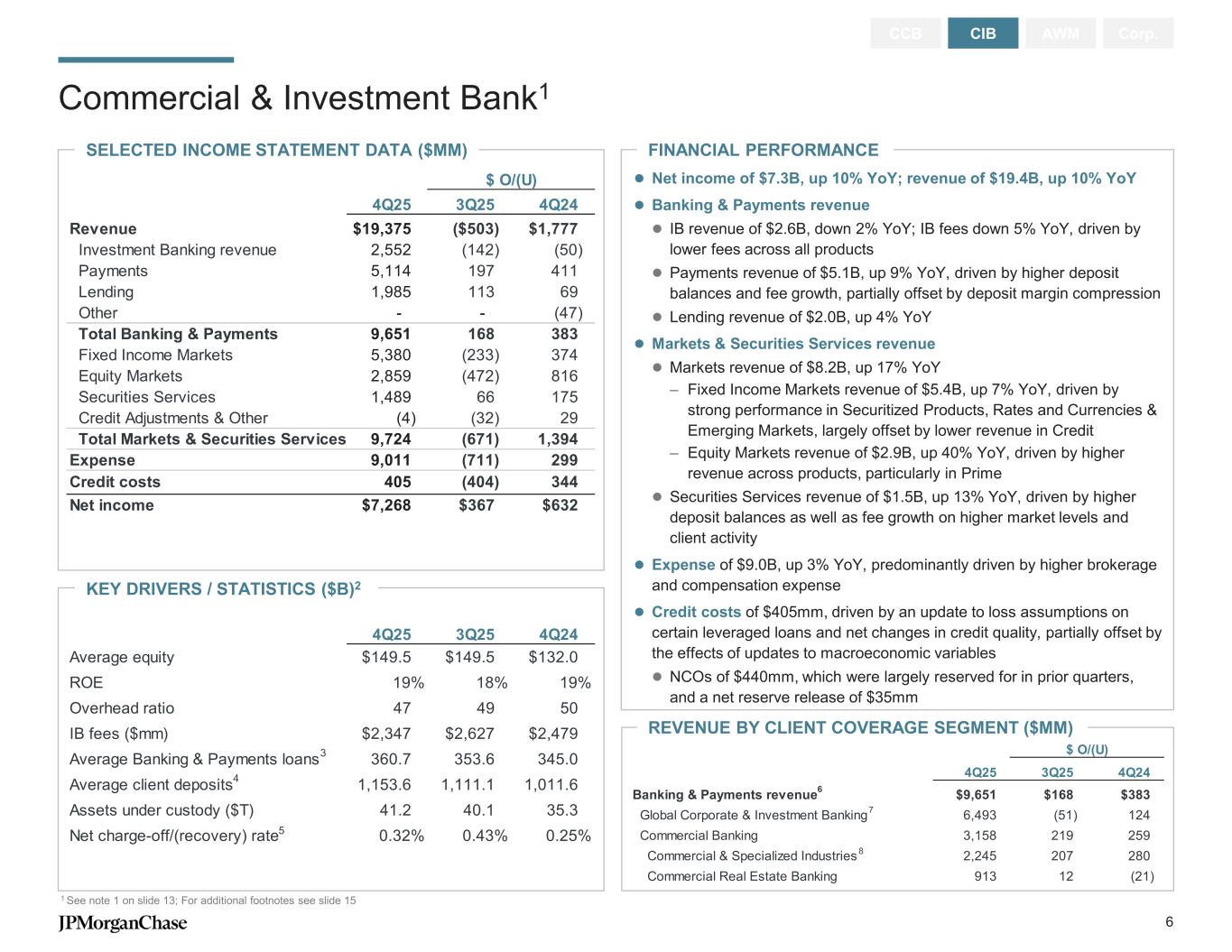 REVENUE BY CLIENT COVERAGE SEGMENT ($MM) KEY DRIVERS / STATISTICS ($B)2 FINANCIAL PERFORMANCE Commercial & Investment Bank1 1 See note 1 on slide 13; For additional footnotes see slide 15 CCB CIB AWM Corp. SELECTED INCOME STATEMENT DATA ($MM)  Net income of $7.3B, up 10% YoY; revenue of $19.4B, up 10% YoY  Banking & Payments revenue  IB revenue of $2.6B, down 2% YoY; IB fees down 5% YoY, driven by lower fees across all products  Payments revenue of $5.1B, up 9% YoY, driven by higher deposit balances and fee growth, partially offset by deposit margin compression  Lending revenue of $2.0B, up 4% YoY  Markets & Securities Services revenue  Markets revenue of $8.2B, up 17% YoY – Fixed Income Markets revenue of $5.4B, up 7% YoY, driven by strong performance in Securitized Products, Rates and Currencies & Emerging Markets, largely offset by lower revenue in Credit – Equity Markets revenue of $2.9B, up 40% YoY, driven by higher revenue across products, particularly in Prime  Securities Services revenue of $1.5B, up 13% YoY, driven by higher deposit balances as well as fee growth on higher market levels and client activity  Expense of $9.0B, up 3% YoY, predominantly driven by higher brokerage and compensation expense  Credit costs of $405mm, driven by an update to loss assumptions on certain leveraged loans and net changes in credit quality, partially offset by the effects of updates to macroeconomic variables  NCOs of $440mm, which were largely reserved for in prior quarters, and a net reserve release of $35mm $ O/(U) 4Q25 3Q25 4Q24 Revenue $19,375 ($503) $1,777 Investment Banking revenue 2,552 (142) (50) Payments 5,114 197 411 Lending 1,985 113 69 Other - - (47) Total Banking & Payments 9,651 168 383 Fixed Income Markets 5,380 (233) 374 Equity Markets 2,859 (472) 816 Securities Services 1,489 66 175 Credit Adjustments & Other (4) (32) 29 Total Markets & Securities Services 9,724 (671) 1,394 Expense 9,011 (711) 299 Credit costs 405 (404) 344 Net income $7,268 $367 $632 4Q25 3Q25 4Q24 Average equity $149.5 $149.5 $132.0 ROE 19% 18% 19% Overhead ratio 47 49 50 IB fees ($mm) $2,347 $2,627 $2,479 Average Banking & Payments loans 360.7 353.6 345.0 Average client deposits 1,153.6 1,111.1 1,011.6 Assets under custody ($T) 41.2 40.1 35.3 Net charge-off/(recovery) rate 0.32% 0.43% 0.25% 3 5 4 $ O/(U) 4Q25 3Q25 4Q24 Banking & Payments revenue $9,651 $168 $383 Global Corporate & Investment Banking 6,493 (51) 124 Commercial Banking 3,158 219 259 Commercial & Specialized Industries 2,245 207 280 Commercial Real Estate Banking 913 12 (21) 7 8 6 6