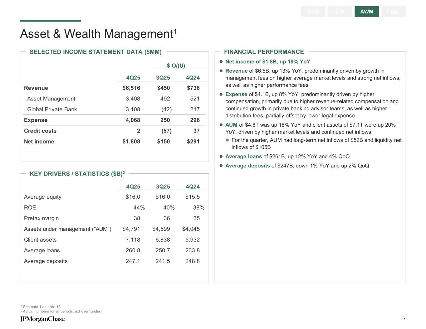 FINANCIAL PERFORMANCESELECTED INCOME STATEMENT DATA ($MM) Asset & Wealth Management1 1 See note 1 on slide 13 2 Actual numbers for all periods, not over/(under) CCB CIB AWM Corp. KEY DRIVERS / STATISTICS ($B)2  Net income of $1.8B, up 19% YoY  Revenue of $6.5B, up 13% YoY, predominantly driven by growth in management fees on higher average market levels and strong net inflows, as well as higher performance fees  Expense of $4.1B, up 8% YoY, predominantly driven by higher compensation, primarily due to higher revenue-related compensation and continued growth in private banking advisor teams, as well as higher distribution fees, partially offset by lower legal expense  AUM of $4.8T was up 18% YoY and client assets of $7.1T were up 20% YoY, driven by higher market levels and continued net inflows  For the quarter, AUM had long-term net inflows of $52B and liquidity net inflows of $105B  Average loans of $261B, up 12% YoY and 4% QoQ  Average deposits of $247B, down 1% YoY and up 2% QoQ $ O/(U) 4Q25 3Q25 4Q24 Revenue $6,516 $450 $738 Asset Management 3,408 492 521 Global Private Bank 3,108 (42) 217 Expense 4,068 250 296 Credit costs 2 (57) 37 Net income $1,808 $150 $291 4Q25 3Q25 4Q24 Average equity $16.0 $16.0 $15.5 ROE 44% 40% 38% Pretax margin 38 36 35 Assets under management ("AUM") $4,791 $4,599 $4,045 Client assets 7,118 6,838 5,932 Average loans 260.8 250.7 233.8 Average deposits 247.1 241.5 248.8 7