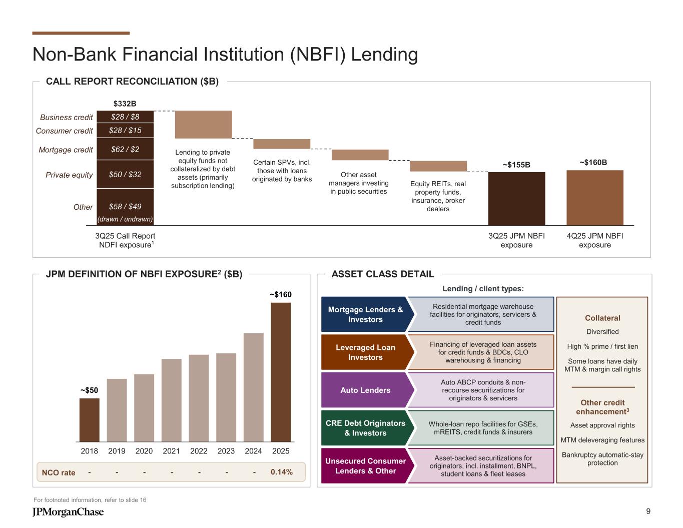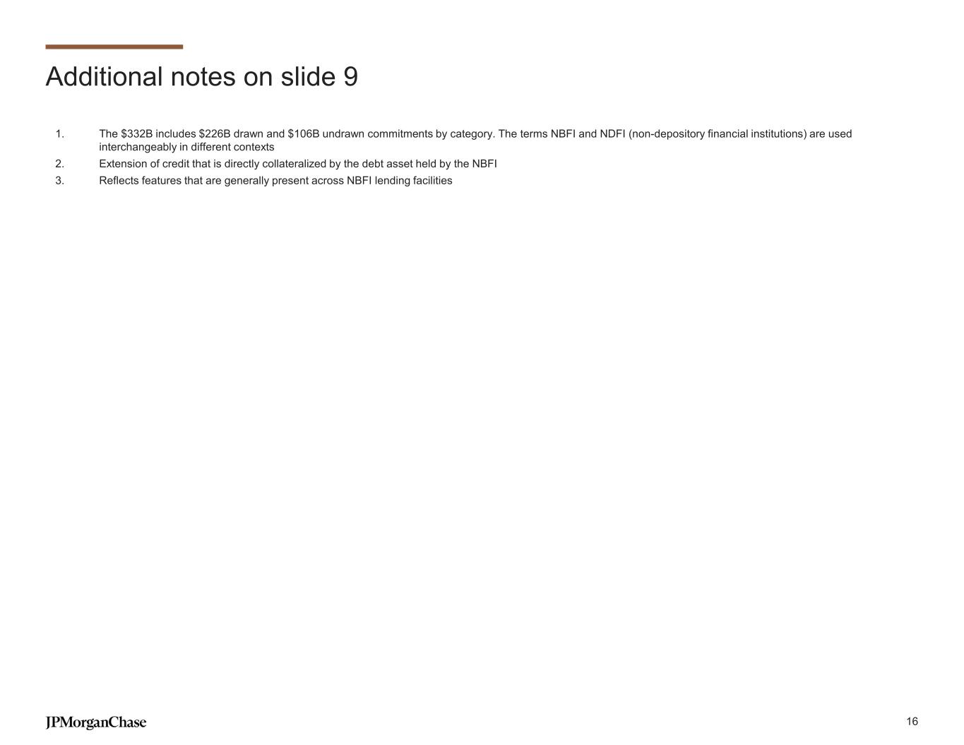 Non-Bank Financial Institution (NBFI) Lending For footnoted information, refer to slide 16 ~$155B 3Q25 Call Report NDFI exposure 3Q25 JPM NBFI exposure 4Q25 JPM NBFI exposure CALL REPORT RECONCILIATION ($B) Other Private equity Mortgage credit Consumer credit Business credit $332B (drawn / undrawn) $58 / $49 $50 / $32 $62 / $2 $28 / $15 $28 / $8 1 Lending to private equity funds not collateralized by debt assets (primarily subscription lending) Other asset managers investing in public securities Certain SPVs, incl. those with loans originated by banks Equity REITs, real property funds, insurance, broker dealers JPM DEFINITION OF NBFI EXPOSURE2 ($B) ~$50 ~$160 2018 2019 2020 2021 2022 2023 2024 2025 Lending / client types: ASSET CLASS DETAIL Auto ABCP conduits & non- recourse securitizations for originators & servicers Auto Lenders Residential mortgage warehouse facilities for originators, servicers & credit funds Mortgage Lenders & Investors Financing of leveraged loan assets for credit funds & BDCs, CLO warehousing & financing Leveraged Loan Investors Asset-backed securitizations for originators, incl. installment, BNPL, student loans & fleet leases Unsecured Consumer Lenders & Other Whole-loan repo facilities for GSEs, mREITS, credit funds & insurers CRE Debt Originators & Investors Collateral Diversified High % prime / first lien Some loans have daily MTM & margin call rights Other credit enhancement3 Asset approval rights MTM deleveraging features Bankruptcy automatic-stay protection -NCO rate - - - - - - 0.14% ~$160B 9