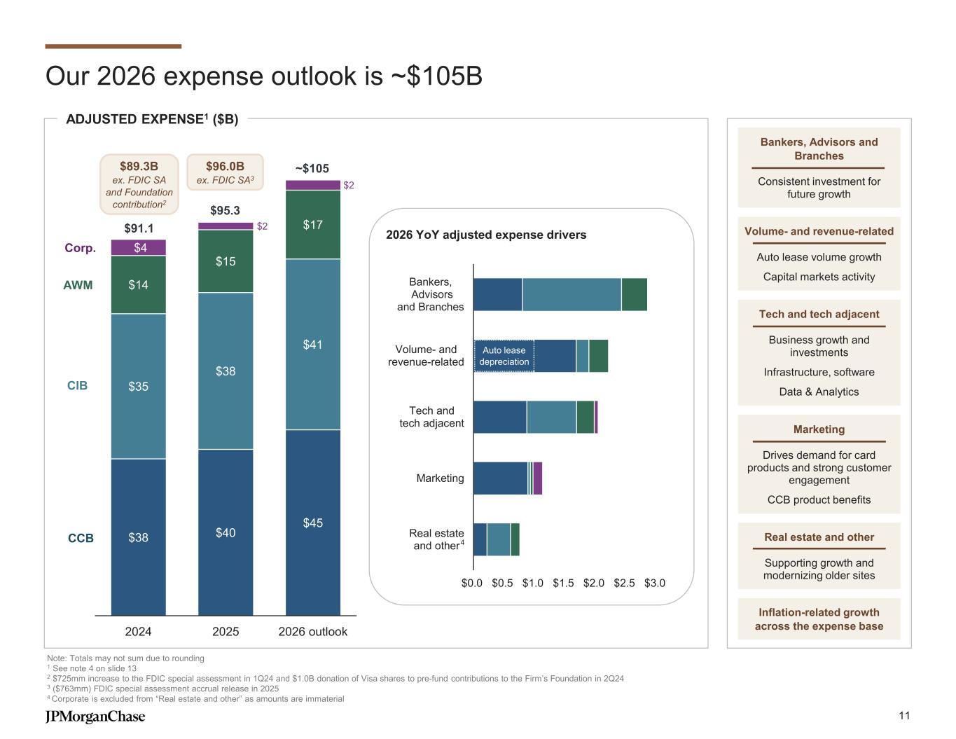 $224 $239 4Q24 4Q25 $91 ($2.0) $4.5 2025 2026 outlook We expect ~$95B of NII ex. Markets for 2026 1 See note 2 on slide 13 2 Outlook is based on implied rate curve as of January 8, 2026 3 Federal Funds target upper bound (“FFTUB”) 4 Interest on reserve balances (“IORB”) Rates / margins2  2 rate cuts (3.25% FFTUB3 at YE) – Average IORB4 declines 92bps YoY – Deposit margin compression 2Q: $23 3Q: $23 4Q: $24 $92.6 ~$95 Balance sheet growth / mix  Card revolve growth and modestly higher Consumer and Wholesale deposit balances NET INTEREST INCOME EX. MARKETS1 ($B) 1Q: $23 Markets NII: $3.3B Firmwide NII: $95.9B Markets NII: ~$8B Firmwide NII: ~$103B AVERAGE LOANS ($B) Firmwide BWM FirmwideCard Services $1,339 $1,461 4Q24 4Q25 Revolving Transactor O/S AVERAGE DEPOSITS ($B) $1,035 $1,040 $2,417 $2,565 4Q24 4Q25 10