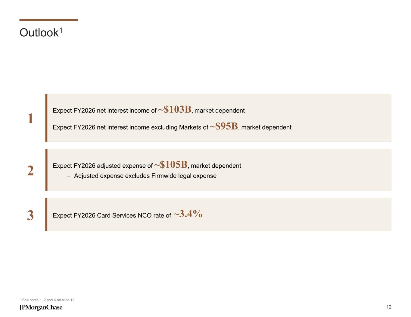 Outlook1 1 See notes 1, 2 and 4 on slide 13 Expect FY2026 net interest income of ~$103B, market dependent Expect FY2026 net interest income excluding Markets of ~$95B, market dependent Expect FY2026 Card Services NCO rate of ~3.4%3 Expect FY2026 adjusted expense of ~$105B, market dependent – Adjusted expense excludes Firmwide legal expense2 1 12