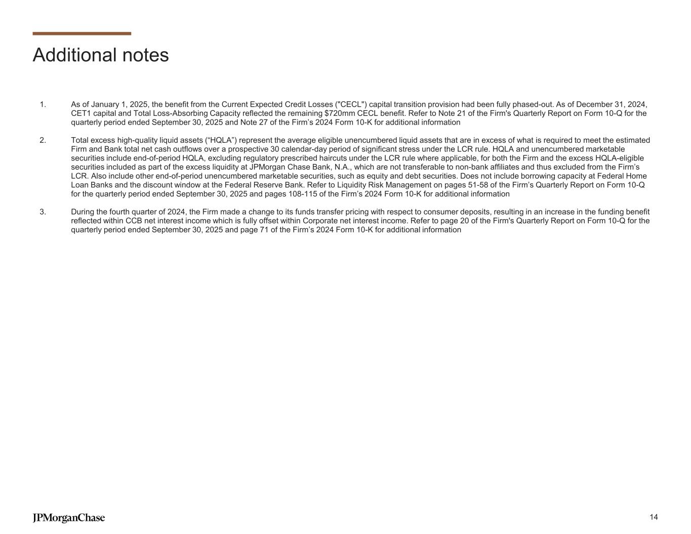 Additional notes 1. As of January 1, 2025, the benefit from the Current Expected Credit Losses ("CECL") capital transition provision had been fully phased-out. As of December 31, 2024, CET1 capital and Total Loss-Absorbing Capacity reflected the remaining $720mm CECL benefit. Refer to Note 21 of the Firm's Quarterly Report on Form 10-Q for the quarterly period ended September 30, 2025 and Note 27 of the Firm’s 2024 Form 10-K for additional information 2. Total excess high-quality liquid assets (“HQLA”) represent the average eligible unencumbered liquid assets that are in excess of what is required to meet the estimated Firm and Bank total net cash outflows over a prospective 30 calendar-day period of significant stress under the LCR rule. HQLA and unencumbered marketable securities include end-of-period HQLA, excluding regulatory prescribed haircuts under the LCR rule where applicable, for both the Firm and the excess HQLA-eligible securities included as part of the excess liquidity at JPMorgan Chase Bank, N.A., which are not transferable to non-bank affiliates and thus excluded from the Firm’s LCR. Also include other end-of-period unencumbered marketable securities, such as equity and debt securities. Does not include borrowing capacity at Federal Home Loan Banks and the discount window at the Federal Reserve Bank. Refer to Liquidity Risk Management on pages 51-58 of the Firm’s Quarterly Report on Form 10-Q for the quarterly period ended September 30, 2025 and pages 108-115 of the Firm’s 2024 Form 10-K for additional information 3. During the fourth quarter of 2024, the Firm made a change to its funds transfer pricing with respect to consumer deposits, resulting in an increase in the funding benefit reflected within CCB net interest income which is fully offset within Corporate net interest income. Refer to page 20 of the Firm's Quarterly Report on Form 10-Q for the quarterly period ended September 30, 2025 and page 71 of the Firm’s 2024 Form 10-K for additional information 14