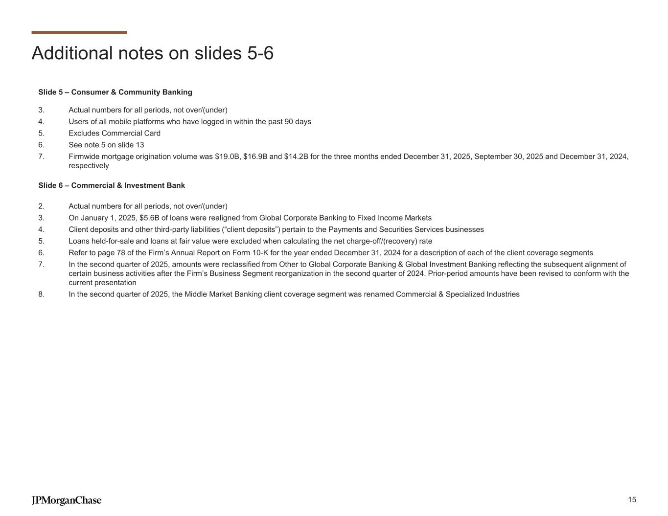 Additional notes on slides 5-6 Slide 5 – Consumer & Community Banking 3. Actual numbers for all periods, not over/(under) 4. Users of all mobile platforms who have logged in within the past 90 days 5. Excludes Commercial Card 6. See note 5 on slide 13 7. Firmwide mortgage origination volume was $19.0B, $16.9B and $14.2B for the three months ended December 31, 2025, September 30, 2025 and December 31, 2024, respectively Slide 6 – Commercial & Investment Bank 2. Actual numbers for all periods, not over/(under) 3. On January 1, 2025, $5.6B of loans were realigned from Global Corporate Banking to Fixed Income Markets 4. Client deposits and other third-party liabilities (“client deposits”) pertain to the Payments and Securities Services businesses 5. Loans held-for-sale and loans at fair value were excluded when calculating the net charge-off/(recovery) rate 6. Refer to page 78 of the Firm’s Annual Report on Form 10-K for the year ended December 31, 2024 for a description of each of the client coverage segments 7. In the second quarter of 2025, amounts were reclassified from Other to Global Corporate Banking & Global Investment Banking reflecting the subsequent alignment of certain business activities after the Firm’s Business Segment reorganization in the second quarter of 2024. Prior-period amounts have been revised to conform with the current presentation 8. In the second quarter of 2025, the Middle Market Banking client coverage segment was renamed Commercial & Specialized Industries 15