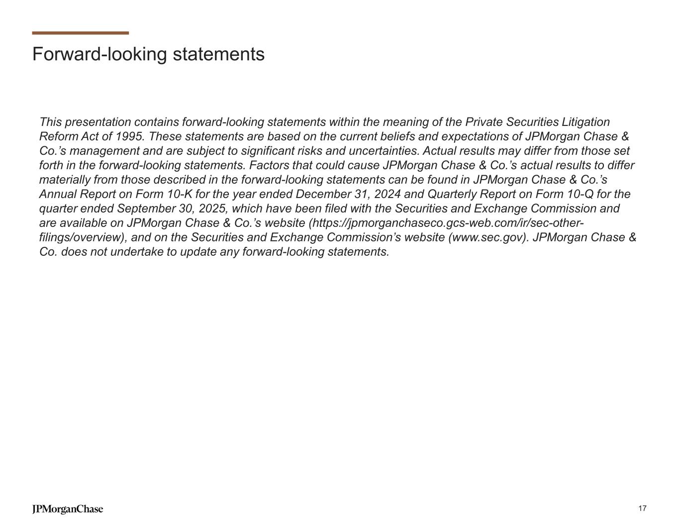 Forward-looking statements This presentation contains forward-looking statements within the meaning of the Private Securities Litigation Reform Act of 1995. These statements are based on the current beliefs and expectations of JPMorgan Chase & Co.’s management and are subject to significant risks and uncertainties. Actual results may differ from those set forth in the forward-looking statements. Factors that could cause JPMorgan Chase & Co.’s actual results to differ materially from those described in the forward-looking statements can be found in JPMorgan Chase & Co.’s Annual Report on Form 10-K for the year ended December 31, 2024 and Quarterly Report on Form 10-Q for the quarter ended September 30, 2025, which have been filed with the Securities and Exchange Commission and are available on JPMorgan Chase & Co.’s website (https://jpmorganchaseco.gcs-web.com/ir/sec-other- filings/overview), and on the Securities and Exchange Commission’s website (www.sec.gov). JPMorgan Chase & Co. does not undertake to update any forward-looking statements. 17