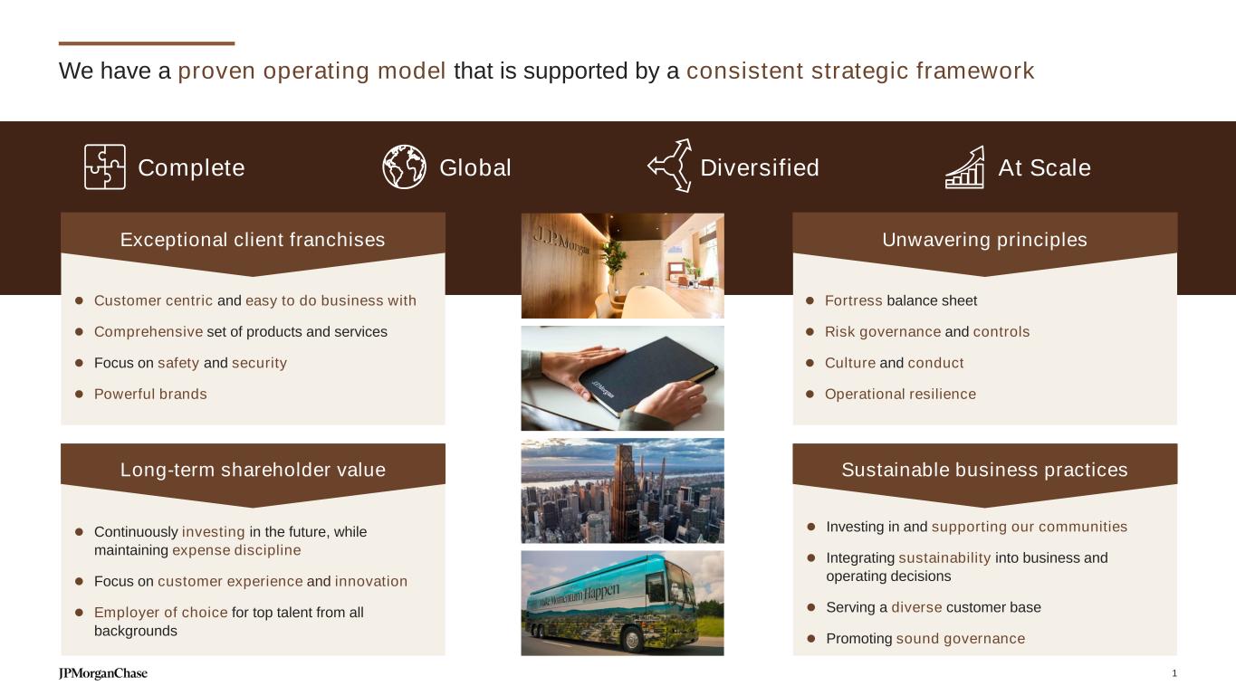 Complete Global Diversified At Scale We have a proven operating model that is supported by a consistent strategic framework ⚫ Continuously investing in the future, while maintaining expense discipline ⚫ Focus on customer experience and innovation ⚫ Employer of choice for top talent from all backgrounds Long-term shareholder value ⚫ Customer centric and easy to do business with ⚫ Comprehensive set of products and services ⚫ Focus on safety and security ⚫ Powerful brands ⚫ Fortress balance sheet ⚫ Risk governance and controls ⚫ Culture and conduct ⚫ Operational resilience Unwavering principles ⚫ Investing in and supporting our communities ⚫ Integrating sustainability into business and operating decisions ⚫ Serving a diverse customer base ⚫ Promoting sound governance Sustainable business practices Exceptional client franchises 1