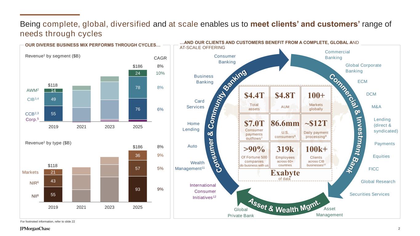 $118 $186 55 76 49 78 14 24 2019 2021 2023 2025 Being complete, global, diversified and at scale enables us to meet clients’ and customers’ range of needs through cycles CCB2,3 CIB3,4 AWM2 Corp.5 Revenue1 by segment ($B) OUR DIVERSE BUSINESS MIX PERFORMS THROUGH CYCLES… 55 93 43 57 21 36 $118 $186 2019 2021 2023 2025 NII6 NIR6 Markets Revenue1 by type ($B) For footnoted information, refer to slide 22 CAGR 10% 8% 6% 9% 5% 9% 8% 8% C o n s u m e r & C o m m u n it y B an ki ng Asset & Wealth Mgmt. Com m erc ia l & In v e s tm e n t B a n k Fill level DCM Lending (direct & syndicated) Payments M&A FICC Equities Global Research ECM Business Banking International Consumer Initiatives12 Wealth Management11 Home Lending Auto Asset Management Securities Services Global Private Bank Card Services Global Corporate Banking Commercial BankingConsumer Banking Total assets AUM U.S. consumers8 Clients across CIB businesses10 Employees across 60+ countries Of Fortune 500 companies do business with us Consumer payments outflows7 Daily payment processing9 Markets globally $4.8T 86.6mm 319k>90% $7.0T ~$12T 100+$4.4T of data Exabyte 100k+ …AND OUR CLIENTS AND CUSTOMERS BENEFIT FROM A COMPLETE, GLOBAL AND AT-SCALE OFFERING 2
