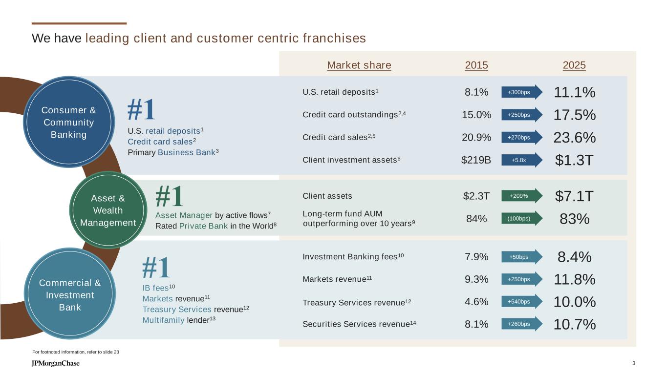 We have leading client and customer centric franchises U.S. retail deposits1 8.1% 11.1% Credit card outstandings2,4 15.0% 17.5% Credit card sales2,5 20.9% 23.6% Client investment assets6 $219B $1.3T Investment Banking fees10 7.9% 8.4% Markets revenue11 9.3% 11.8% Treasury Services revenue12 4.6% 10.0% Securities Services revenue14 8.1% 10.7% Client assets $2.3T $7.1T Long-term fund AUM outperforming over 10 years9 84% 83% +300bps +260bps+250bps +3.5x5.8 +3.5x+209% +3.5x(100bps) +3.5x+50bps +3.5x+250bps +3.5x+540bps +3.5x+260bps For footnoted information, refer to slide 23 #1 IB fees10 Markets revenue11 Treasury Services revenue12 Multifamily lender13 #1 U.S. retail deposits1 Credit card sales2 Primary Business Bank3 #1 Asset Manager by active flows7 Rated Private Bank in the World8 Market share 2015 2025 +3.5x+270bps Consumer & Community Banking Asset & Wealth Management Commercial & Investment Bank 3