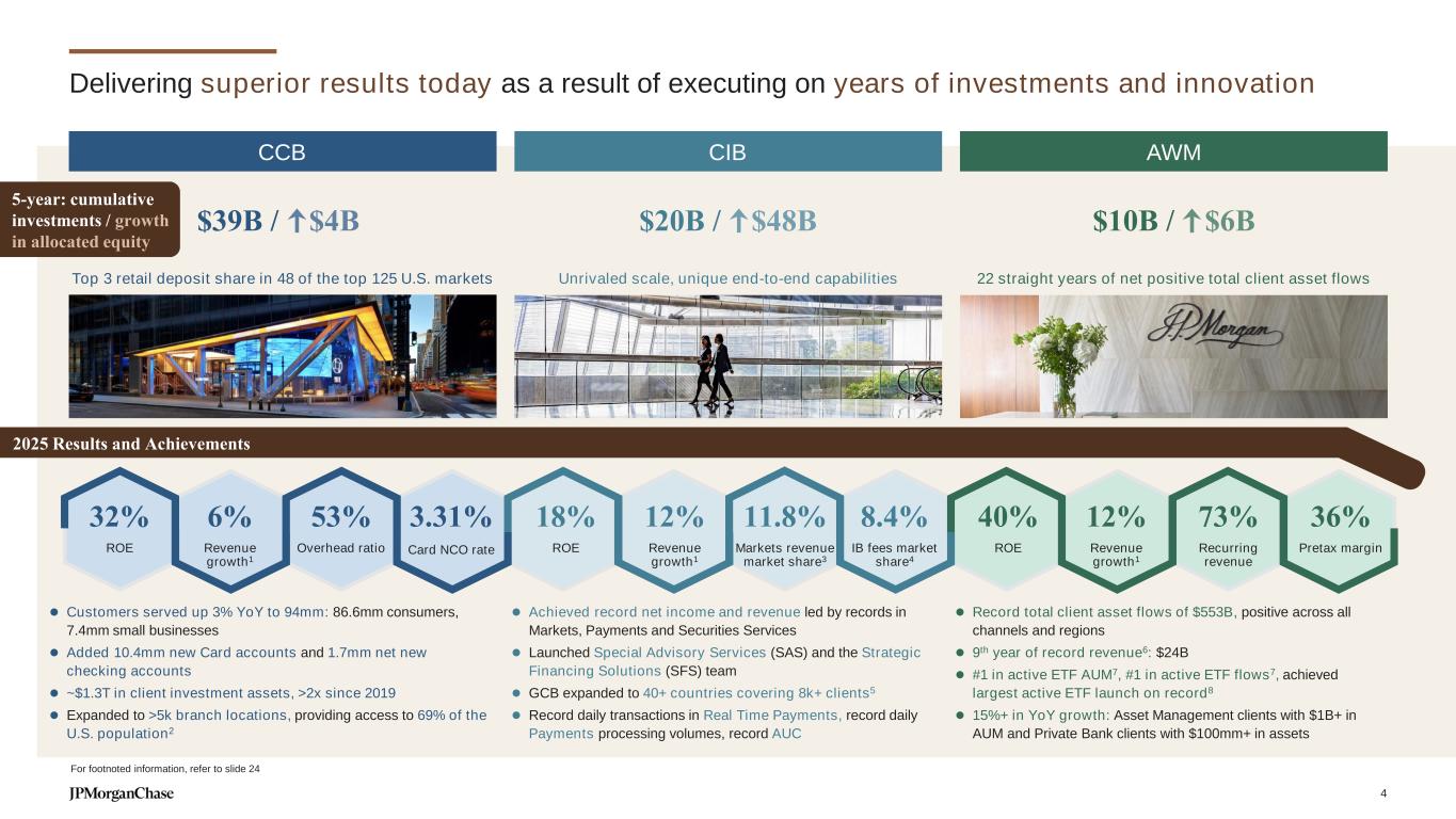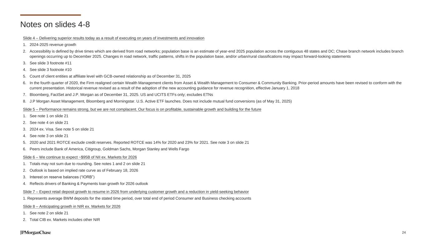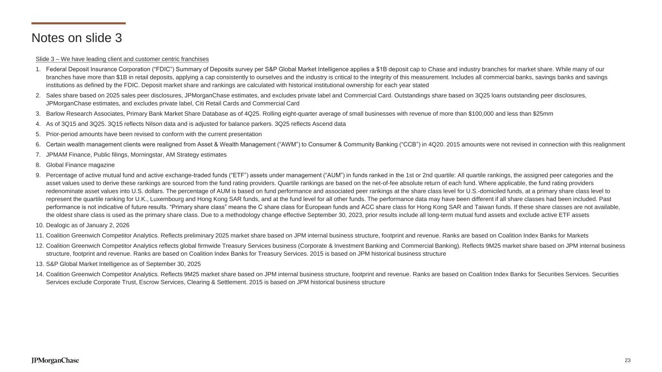 Notes on slide 3 Slide 3 – We have leading client and customer centric franchises 1. Federal Deposit Insurance Corporation (“FDIC”) Summary of Deposits survey per S&P Global Market Intelligence applies a $1B deposit cap to Chase and industry branches for market share. While many of our branches have more than $1B in retail deposits, applying a cap consistently to ourselves and the industry is critical to the integrity of this measurement. Includes all commercial banks, savings banks and savings institutions as defined by the FDIC. Deposit market share and rankings are calculated with historical institutional ownership for each year stated 2. Sales share based on 2025 sales peer disclosures, JPMorganChase estimates, and excludes private label and Commercial Card. Outstandings share based on 3Q25 loans outstanding peer disclosures, JPMorganChase estimates, and excludes private label, Citi Retail Cards and Commercial Card 3. Barlow Research Associates, Primary Bank Market Share Database as of 4Q25. Rolling eight-quarter average of small businesses with revenue of more than $100,000 and less than $25mm 4. As of 3Q15 and 3Q25. 3Q15 reflects Nilson data and is adjusted for balance parkers. 3Q25 reflects Ascend data 5. Prior-period amounts have been revised to conform with the current presentation 6. Certain wealth management clients were realigned from Asset & Wealth Management (“AWM”) to Consumer & Community Banking (“CCB”) in 4Q20. 2015 amounts were not revised in connection with this realignment 7. JPMAM Finance, Public filings, Morningstar, AM Strategy estimates 8. Global Finance magazine 9. Percentage of active mutual fund and active exchange-traded funds (“ETF”) assets under management (“AUM”) in funds ranked in the 1st or 2nd quartile: All quartile rankings, the assigned peer categories and the asset values used to derive these rankings are sourced from the fund rating providers. Quartile rankings are based on the net-of-fee absolute return of each fund. Where applicable, the fund rating providers redenominate asset values into U.S. dollars. The percentage of AUM is based on fund performance and associated peer rankings at the share class level for U.S.-domiciled funds, at a primary share class level to represent the quartile ranking for U.K., Luxembourg and Hong Kong SAR funds, and at the fund level for all other funds. The performance data may have been different if all share classes had been included. Past performance is not indicative of future results. “Primary share class” means the C share class for European funds and ACC share class for Hong Kong SAR and Taiwan funds. If these share classes are not available, the oldest share class is used as the primary share class. Due to a methodology change effective September 30, 2023, prior results include all long-term mutual fund assets and exclude active ETF assets 10. Dealogic as of January 2, 2026 11. Coalition Greenwich Competitor Analytics. Reflects preliminary 2025 market share based on JPM internal business structure, footprint and revenue. Ranks are based on Coalition Index Banks for Markets 12. Coalition Greenwich Competitor Analytics reflects global firmwide Treasury Services business (Corporate & Investment Banking and Commercial Banking). Reflects 9M25 market share based on JPM internal business structure, footprint and revenue. Ranks are based on Coalition Index Banks for Treasury Services. 2015 is based on JPM historical business structure 13. S&P Global Market Intelligence as of September 30, 2025 14. Coalition Greenwich Competitor Analytics. Reflects 9M25 market share based on JPM internal business structure, footprint and revenue. Ranks are based on Coalition Index Banks for Securities Services. Securities Services exclude Corporate Trust, Escrow Services, Clearing & Settlement. 2015 is based on JPM historical business structure 23
