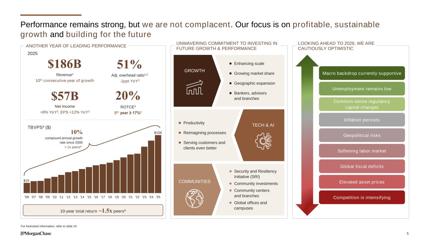 Performance remains strong, but we are not complacent. Our focus is on profitable, sustainable growth and building for the future For footnoted information, refer to slide 24 UNWAVERING COMMITMENT TO INVESTING IN FUTURE GROWTH & PERFORMANCE $108 $19 '06 '07 '08 '09 '10 '11 '12 '13 '14 '15 '16 '17 '18 '19 '20 '21 '22 '23 '24 '25 10% compound annual growth rate since 2006 > 2x peers6 TBVPS4 ($) $186B Revenue1 10th consecutive year of growth 51% Adj. overhead ratio1,2 -1ppt YoY3 $57B Net Income +8% YoY3, EPS +12% YoY3 2025 20% ROTCE4 8th year ≥ 17%5 ANOTHER YEAR OF LEADING PERFORMANCE Macro backdrop currently supportive Unemployment remains low Common-sense regulatory capital changes Competition is intensifying Inflation persists Geopolitical risks Softening labor market Elevated asset prices ⚫ Enhancing scale ⚫ Growing market share ⚫ Geographic expansion ⚫ Bankers, advisors and branches GROWTH ⚫ Productivity ⚫ Reimagining processes ⚫ Serving customers and clients even better TECH & AI ⚫ Security and Resiliency Initiative (SRI) ⚫ Community investments ⚫ Community centers and branches ⚫ Global offices and campuses COMMUNITIES 10-year total return ~1.5x peers6 Global fiscal deficits LOOKING AHEAD TO 2026, WE ARE CAUTIOUSLY OPTIMISTIC 5