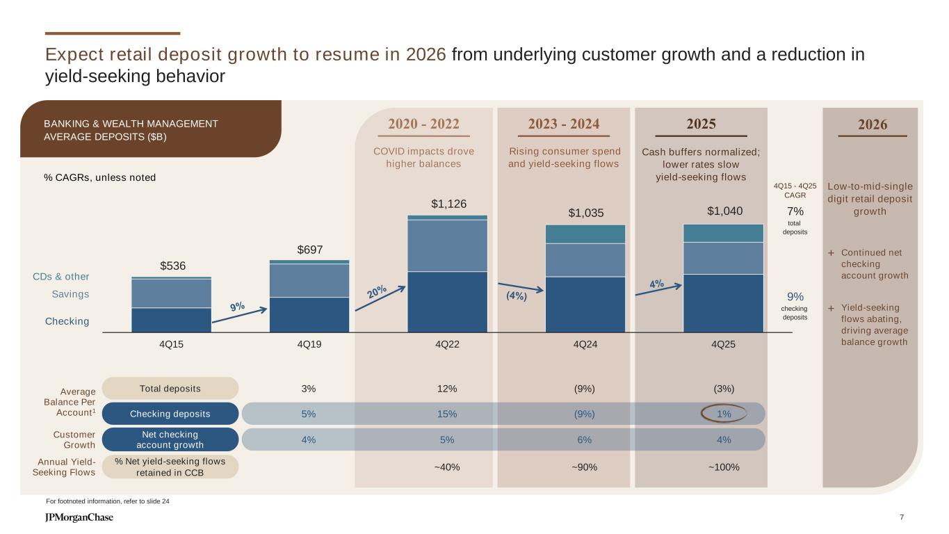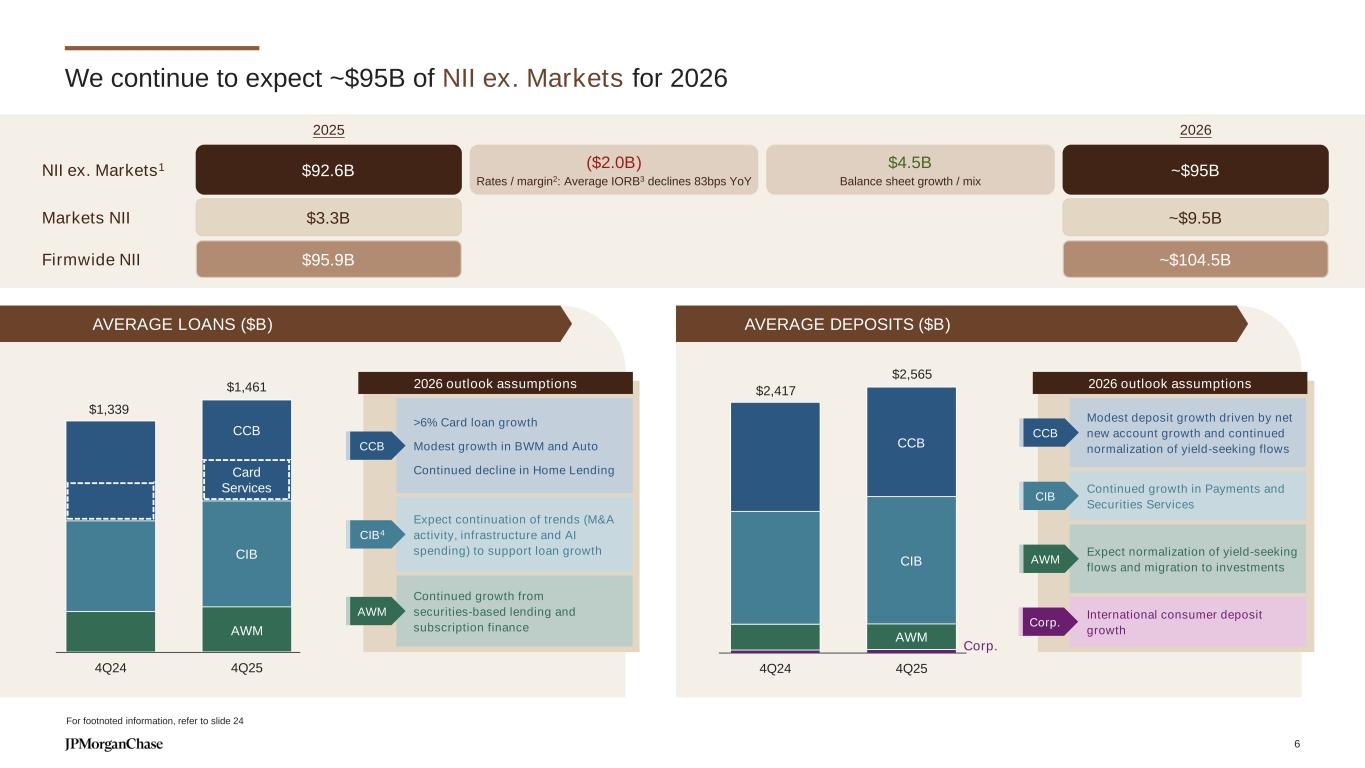 $1,339 $1,461 4Q24 4Q25 $2,417 $2,565 4Q24 4Q25 We continue to expect ~$95B of NII ex. Markets for 2026 For footnoted information, refer to slide 24 CCB AWM 2026 outlook assumptions CCB AWM 2026 outlook assumptions CIB CIB Card Services >6% Card loan growth Modest growth in BWM and Auto Continued decline in Home Lending CCB Expect continuation of trends (M&A activity, infrastructure and AI spending) to support loan growth CIB4 Continued growth from securities-based lending and subscription finance AWM Modest deposit growth driven by net new account growth and continued normalization of yield-seeking flows CCB Continued growth in Payments and Securities Services CIB Expect normalization of yield-seeking flows and migration to investments AWM AVERAGE LOANS ($B) AVERAGE DEPOSITS ($B) Corp. International consumer deposit growth Corp. NII ex. Markets1 $92.6B 2025 ($2.0B) Rates / margin2: Average IORB3 declines 83bps YoY $4.5B Balance sheet growth / mix ~$95B 2026 Markets NII $3.3B ~$9.5B Firmwide NII $95.9B ~$104.5B 6