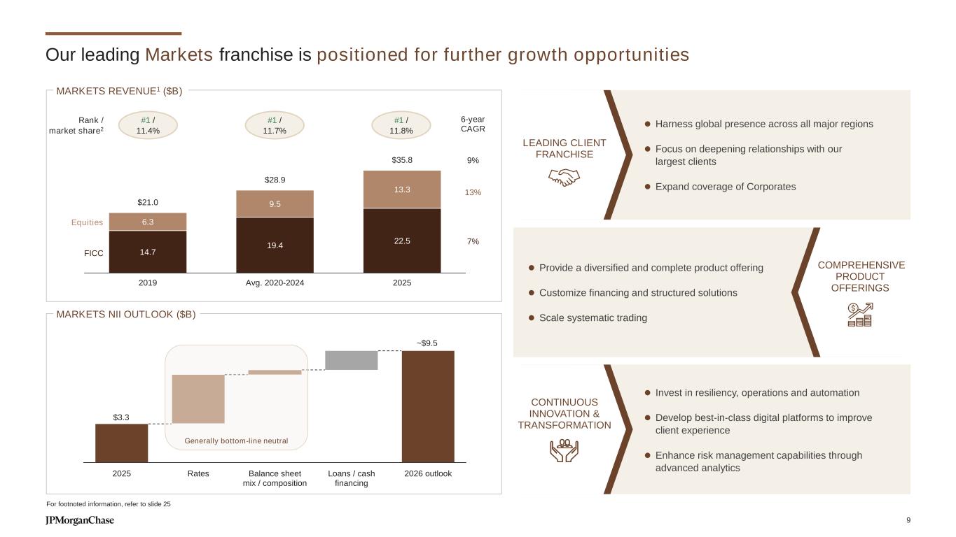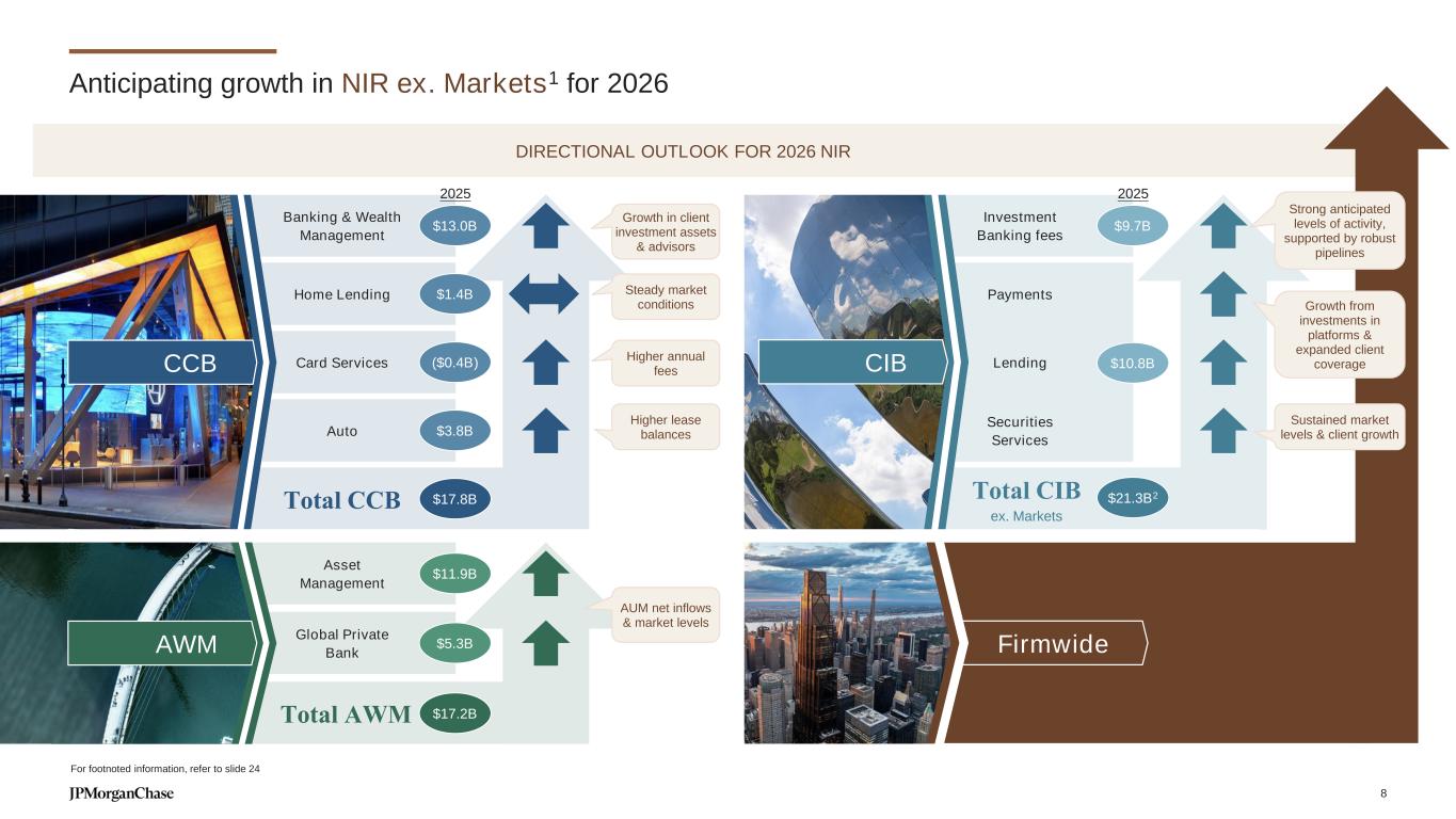 Investment Banking fees Payments Total CIB ex. Markets Lending Securities Services Firmwide Total CCB Banking & Wealth Management Auto Home Lending Card Services Total AWM Asset Management Global Private Bank Anticipating growth in NIR ex. Markets1 for 2026 DIRECTIONAL OUTLOOK FOR 2026 NIR Higher lease balances AUM net inflows & market levels $13.0B $1.4B ($0.4B) $3.8B $11.9B $5.3B $9.7B Growth in client investment assets & advisors AWM CIBCCB Steady market conditions For footnoted information, refer to slide 24 $17.8B $17.2B $10.8B $21.3B2 2025 2025 Sustained market levels & client growth Strong anticipated levels of activity, supported by robust pipelines Growth from investments in platforms & expanded client coverage Higher annual fees 8