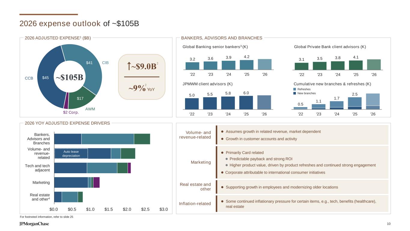 2026 expense outlook of ~$105B CIB AWM Corp. CCB ~$105B$45 $41 $17 $2 $0.0 $0.5 $1.0 $1.5 $2.0 $2.5 $3.0 Auto lease depreciation 2026 YOY ADJUSTED EXPENSE DRIVERS ~$9.0B ~9% YoY BANKERS, ADVISORS AND BRANCHES 5.0 5.5 5.8 6.0 '22 '23 '24 '25 '26 3.2 3.6 3.9 4.2 '22 '23 '24 '25 '26 3.1 3.5 3.8 4.1 '22 '23 '24 '25 '26 0.5 1.1 1.7 2.5 '22 '23 '24 '25 '26 Cumulative new branches & refreshes (K) Global Private Bank client advisors (K) JPMWM client advisors (K) Global Banking senior bankers3 (K) Volume- and revenue-related ⚫ Assumes growth in related revenue, market dependent ⚫ Growth in customer accounts and activity Marketing ⚫ Primarily Card related ⚫ Predictable payback and strong ROI ⚫ Higher product value, driven by product refreshes and continued strong engagement ⚫ Corporate attributable to international consumer initiatives Real estate and other ⚫ Supporting growth in employees and modernizing older locations Inflation-related ⚫ Some continued inflationary pressure for certain items, e.g., tech, benefits (healthcare), real estate Volume- and revenue- related Bankers, Advisors and Branches Tech and tech adjacent Marketing Real estate and other4 2026 ADJUSTED EXPENSE1 ($B) 2 Refreshes New branches 2 For footnoted information, refer to slide 25 10