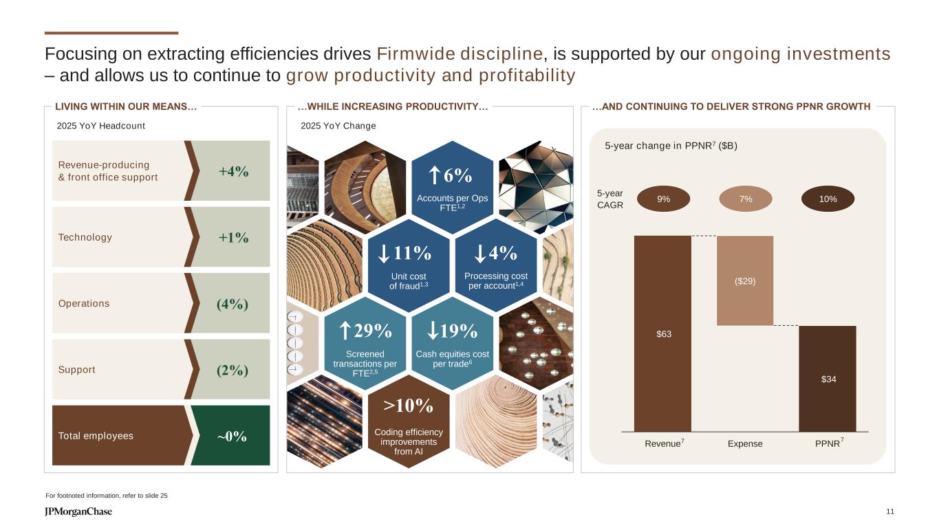 2025 YoY Change Accounts per Ops FTE1,2 Cash equities cost per trade6 Screened transactions per FTE2,5 Coding efficiency improvements from AI Focusing on extracting efficiencies drives Firmwide discipline, is supported by our ongoing investments – and allows us to continue to grow productivity and profitability For footnoted information, refer to slide 25 …AND CONTINUING TO DELIVER STRONG PPNR GROWTH 5-year change in PPNR7 ($B) 7 $63 $34 ($29) Revenue Expense PPNR 5-year CAGR 9% 7% 10% 7 29% 2025 YoY Headcount +4% Revenue-producing & front office support (4%)Operations (2%)Support ~0%Total employees LIVING WITHIN OUR MEANS… +1%Technology …WHILE INCREASING PRODUCTIVITY… Unit cost of fraud1,3 Processing cost per account1,4 11% 4% 19% >10% 6% 11