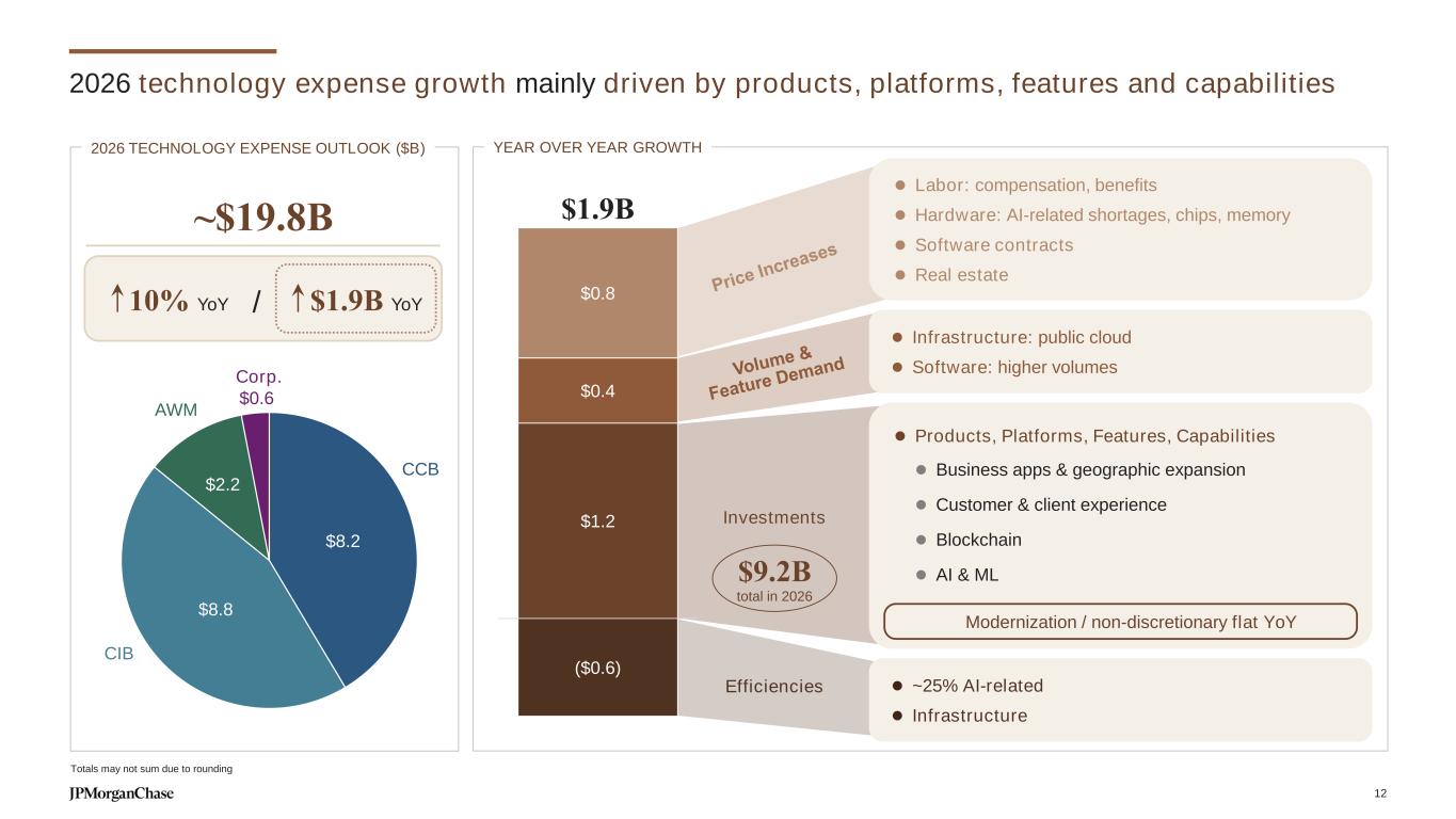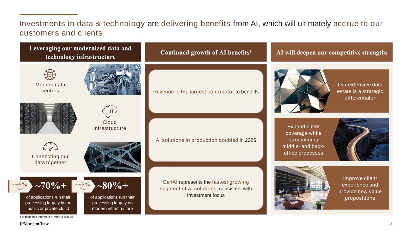 $8.2 $8.8 $2.2 $0.6 ⚫ Products, Platforms, Features, Capabilities ⚫ Business apps & geographic expansion ⚫ Customer & client experience ⚫ Blockchain ⚫ AI & ML 2026 technology expense growth mainly driven by products, platforms, features and capabilities Totals may not sum due to rounding ⚫ Labor: compensation, benefits ⚫ Hardware: AI-related shortages, chips, memory ⚫ Software contracts ⚫ Real estate ⚫ Infrastructure: public cloud ⚫ Software: higher volumes ⚫ ~25% AI-related ⚫ Infrastructure $1.9B Investments 2026 TECHNOLOGY EXPENSE OUTLOOK ($B) ~$19.8B /10% YoY $1.9B YoY $9.2B total in 2026 $1.2 $0.4 $0.8 ($0.6) Efficiencies YEAR OVER YEAR GROWTH Modernization / non-discretionary flat YoY CIB CCB AWM Corp. 12