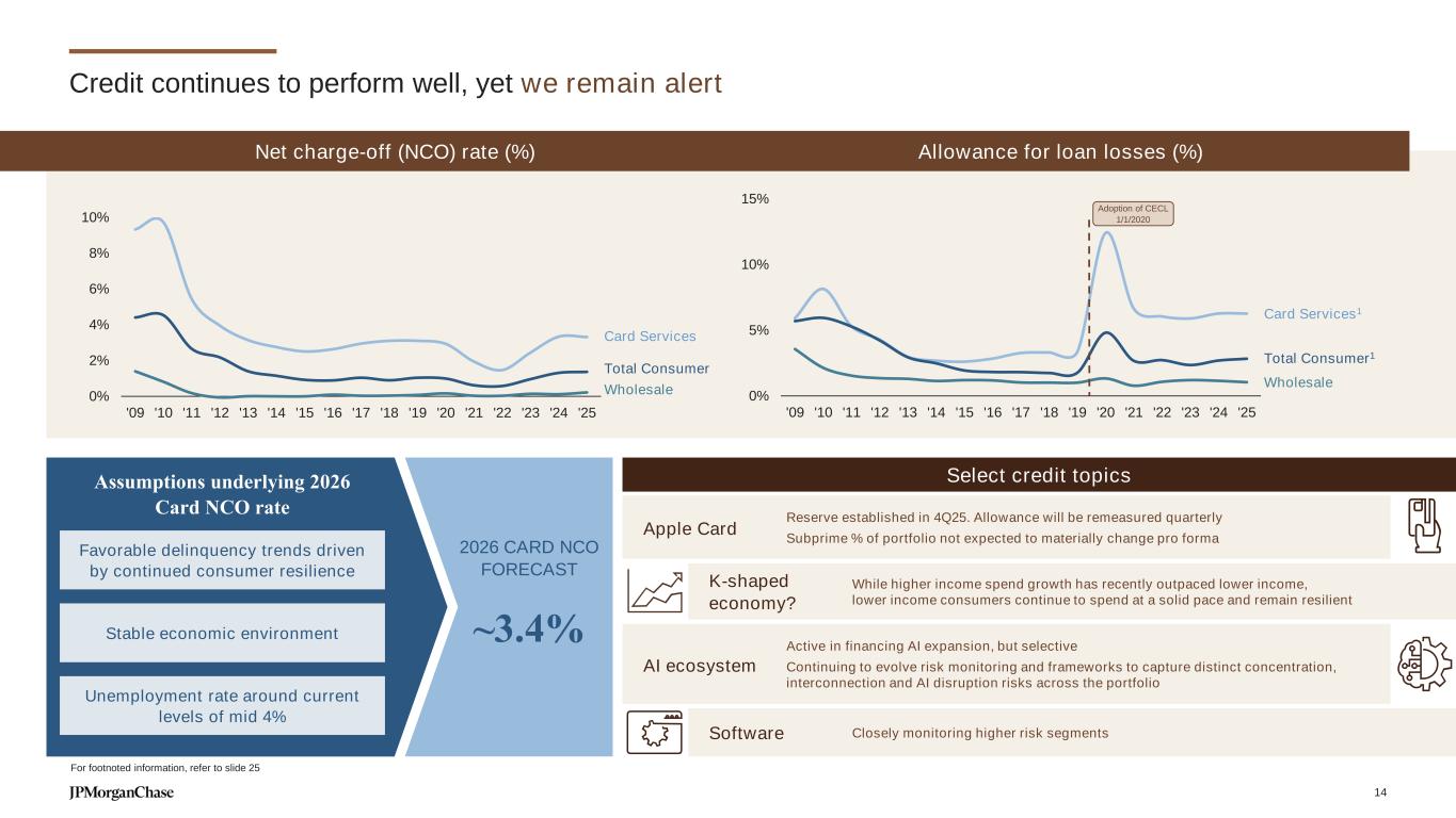 -2% 0% 2% 4% 6% 8% 10% '09 '10 '11 '12 '13 '14 '15 '16 '17 '18 '19 '20 '21 '22 '23 '24 '25 Credit continues to perform well, yet we remain alert Net charge-off (NCO) rate (%) Card Services Total Consumer 2026 CARD NCO FORECAST ~3.4% Favorable delinquency trends driven by continued consumer resilience Assumptions underlying 2026 Card NCO rate Stable economic environment Wholesale Allowance for loan losses (%) 0% 5% 10% 15% '09 '10 '11 '12 '13 '14 '15 '16 '17 '18 '19 '20 '21 '22 '23 '24 '25 Card Services1 Total Consumer1 Wholesale Reserve established in 4Q25. Allowance will be remeasured quarterly Subprime % of portfolio not expected to materially change pro forma Apple Card While higher income spend growth has recently outpaced lower income, lower income consumers continue to spend at a solid pace and remain resilient K-shaped economy? Closely monitoring higher risk segmentsSoftware Active in financing AI expansion, but selective Continuing to evolve risk monitoring and frameworks to capture distinct concentration, interconnection and AI disruption risks across the portfolio AI ecosystem Unemployment rate around current levels of mid 4% Adoption of CECL 1/1/2020 Select credit topics For footnoted information, refer to slide 25 14